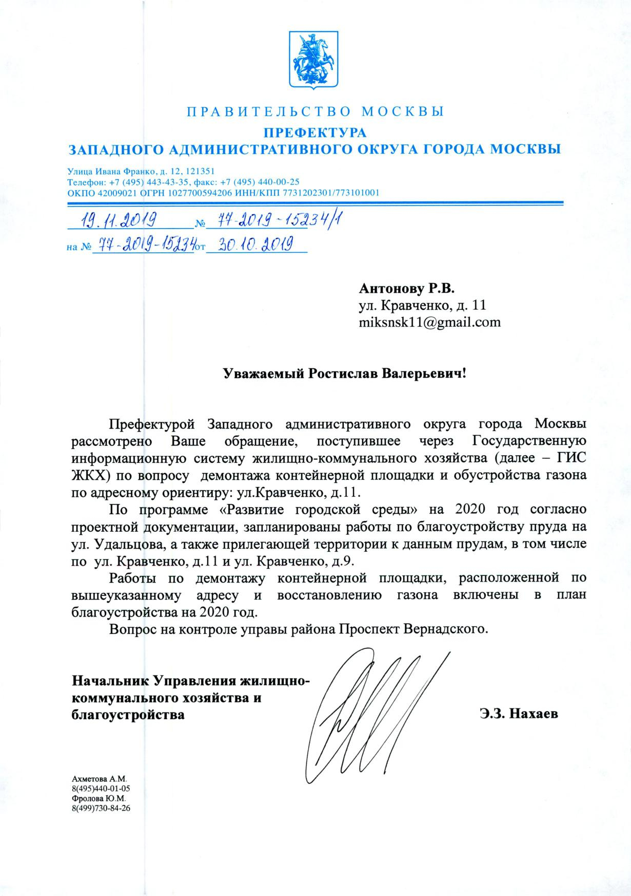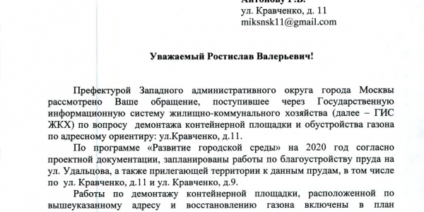 Номер жалобы:61573 Тип жалобы:Иные проблемы ЖКХ Название объекта: Регион:Москва Город:Москва Адрес:улица Кравченко, 11 Описание жалобы:Следует демонтировать стены бывшей контейнерной площадки, ныне никак неиспользуемой, и асфальтовое покрытие внутри неё и воссоздать газон на её месте Статус: