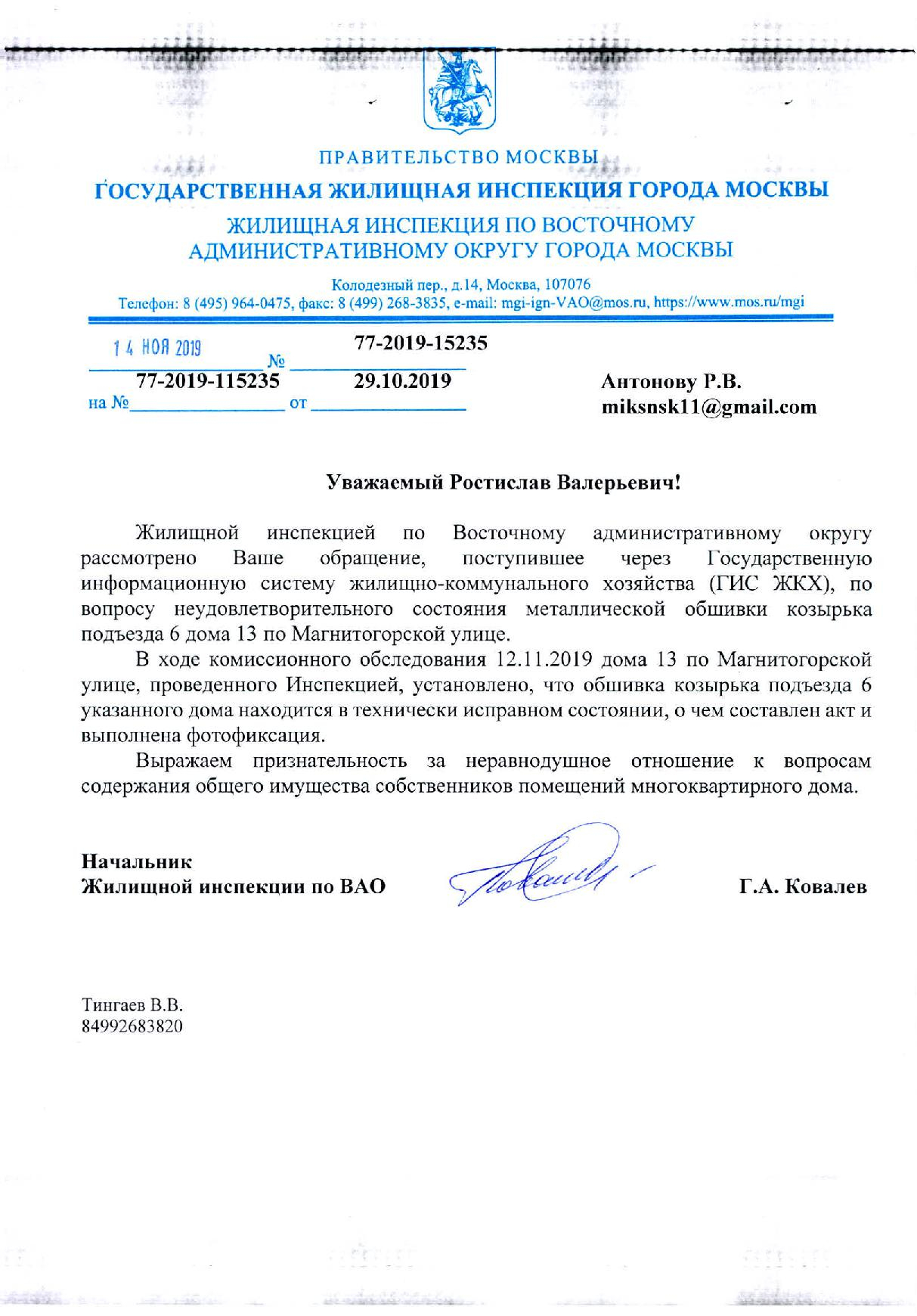 Номер жалобы:61594 Тип жалобы:Иные проблемы ЖКХ Название объекта: Регион:Москва Город:Москва Адрес:Магнитогорская улица, 13 Описание жалобы:На 6 подъезде болтается лист железа Статус: