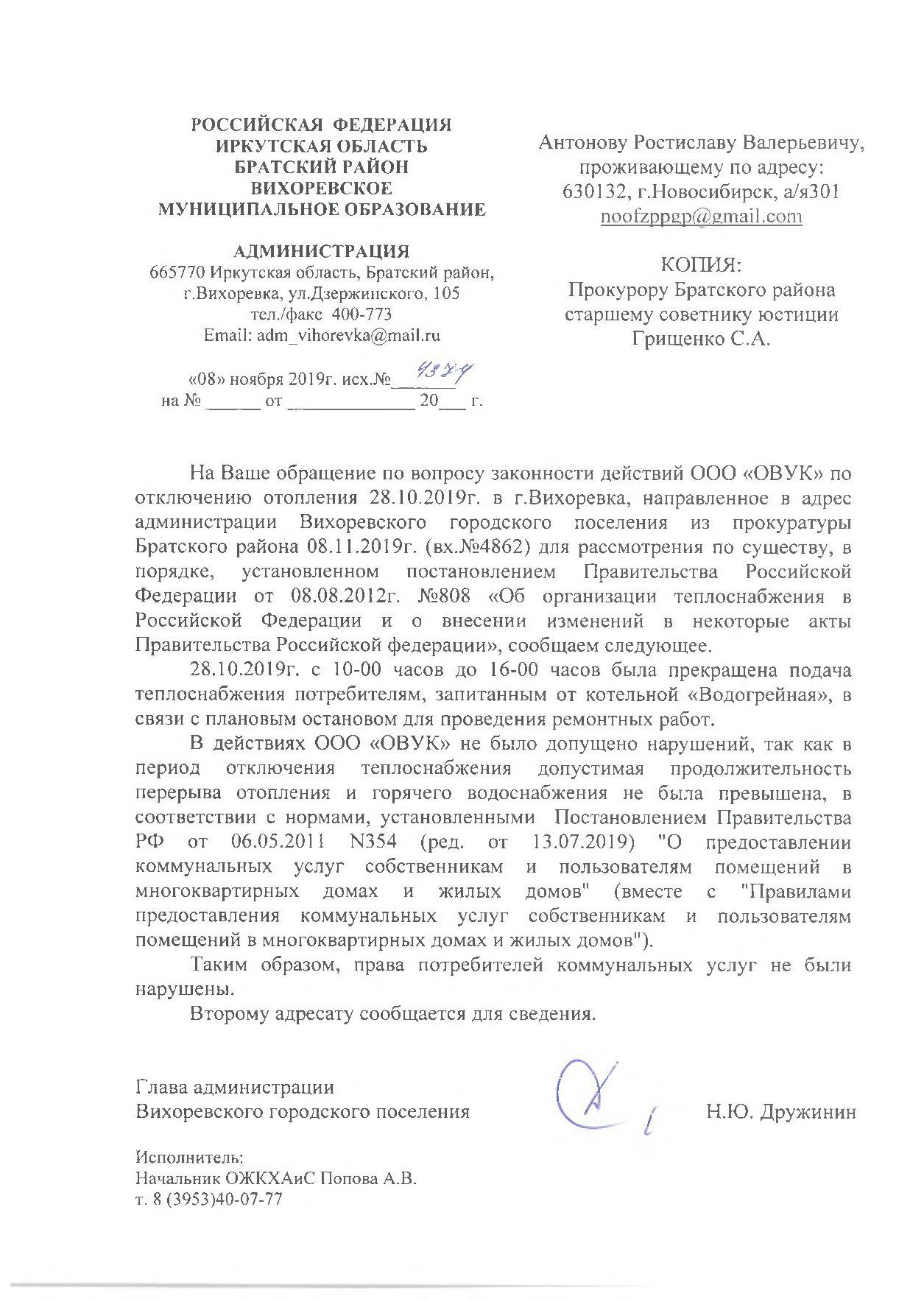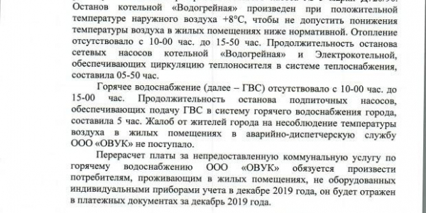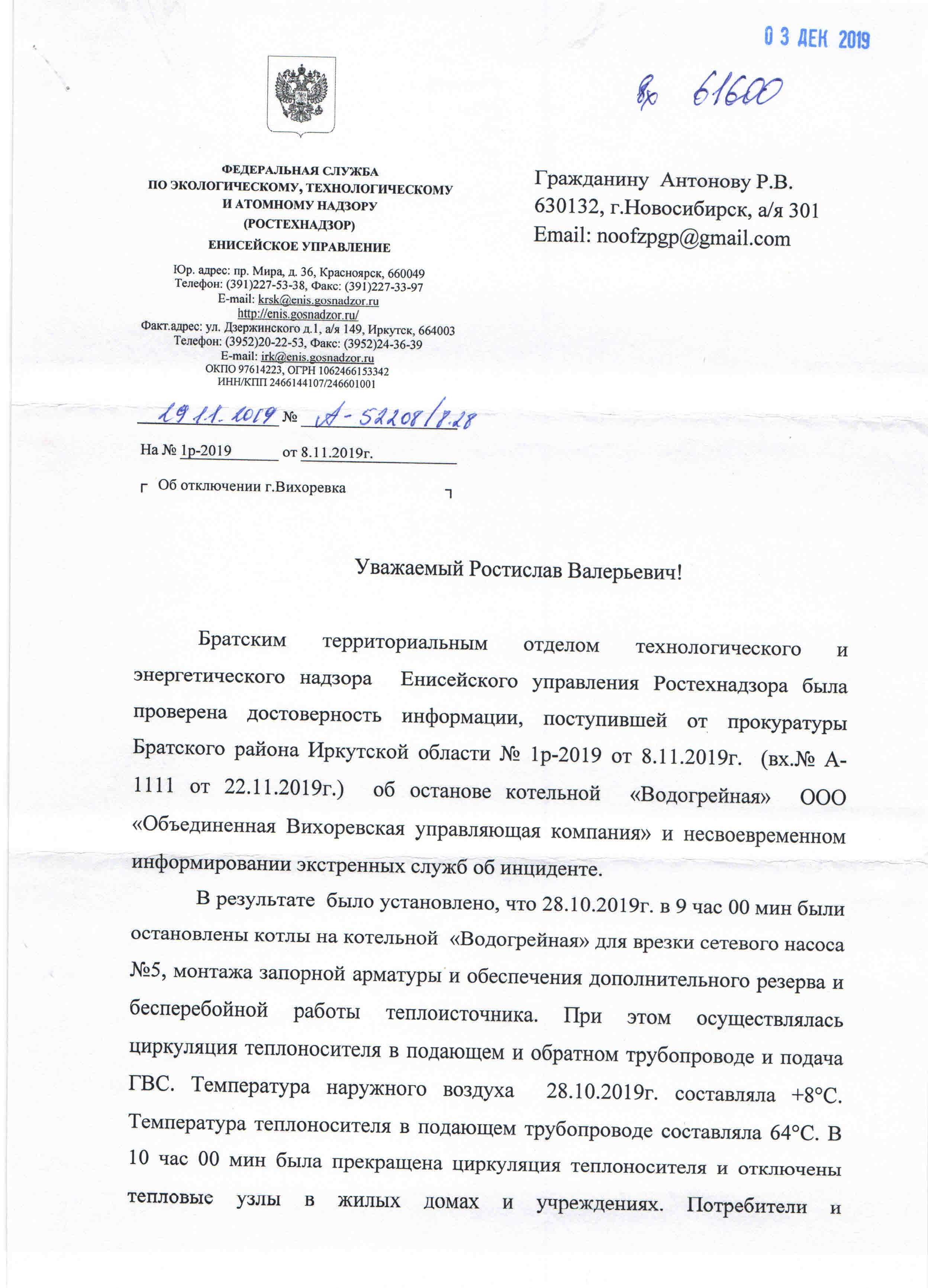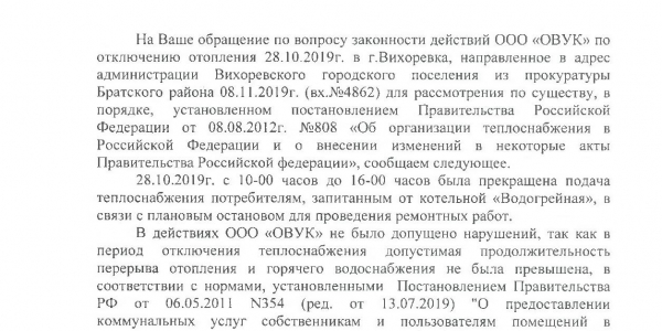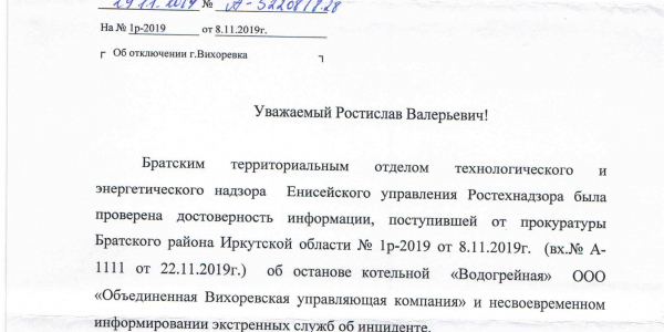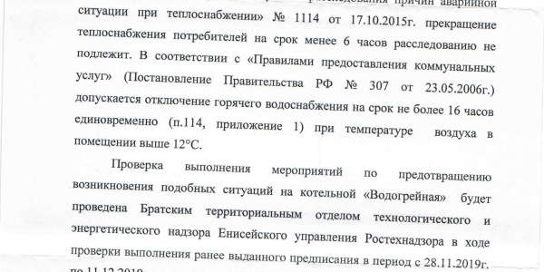 Номер жалобы:61600 Тип жалобы:Иные проблемы ЖКХ Название объекта: Регион:Иркутская область Город:Вихоревка Адрес:Вихоревка Описание жалобы:Может ли быть плановое отключение котельной в Вихоревке на ремонт, в разгар отопительного сезона?