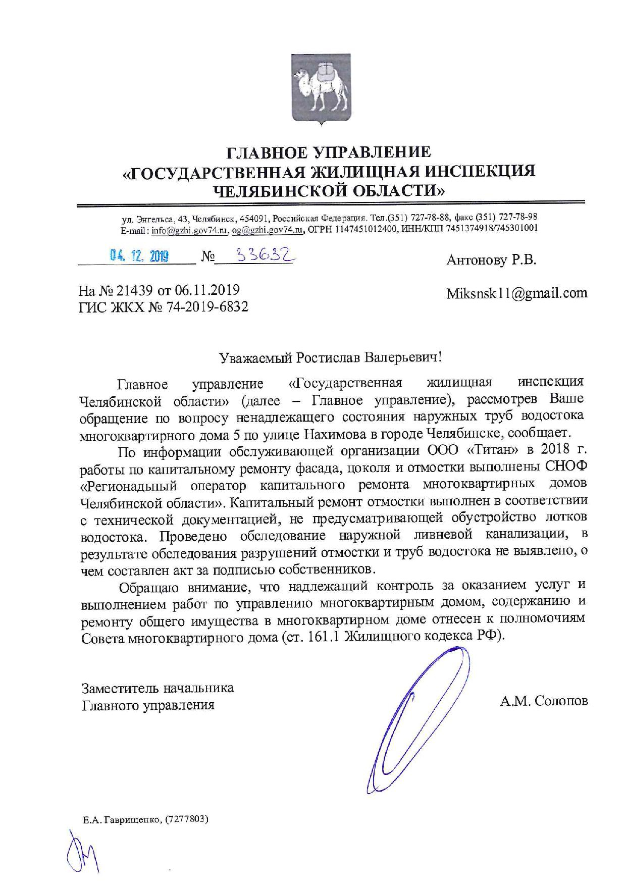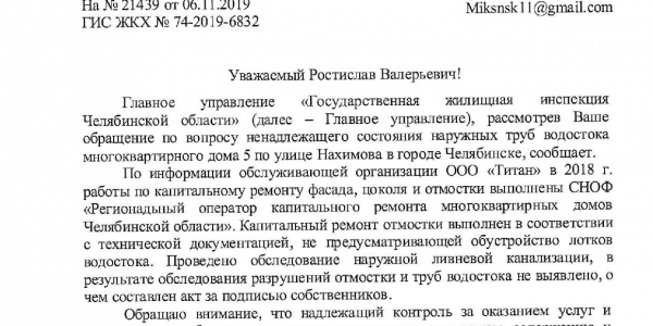 Номер жалобы:61645 Тип жалобы:Иные проблемы ЖКХ Название объекта: Регион:Челябинская область Город:Челябинск Адрес:улица Нахимова, 5 Описание жалобы:Отсутствие (недопустимая высота), выпускного колена и приемного лотка на водосточных трубах Статус: