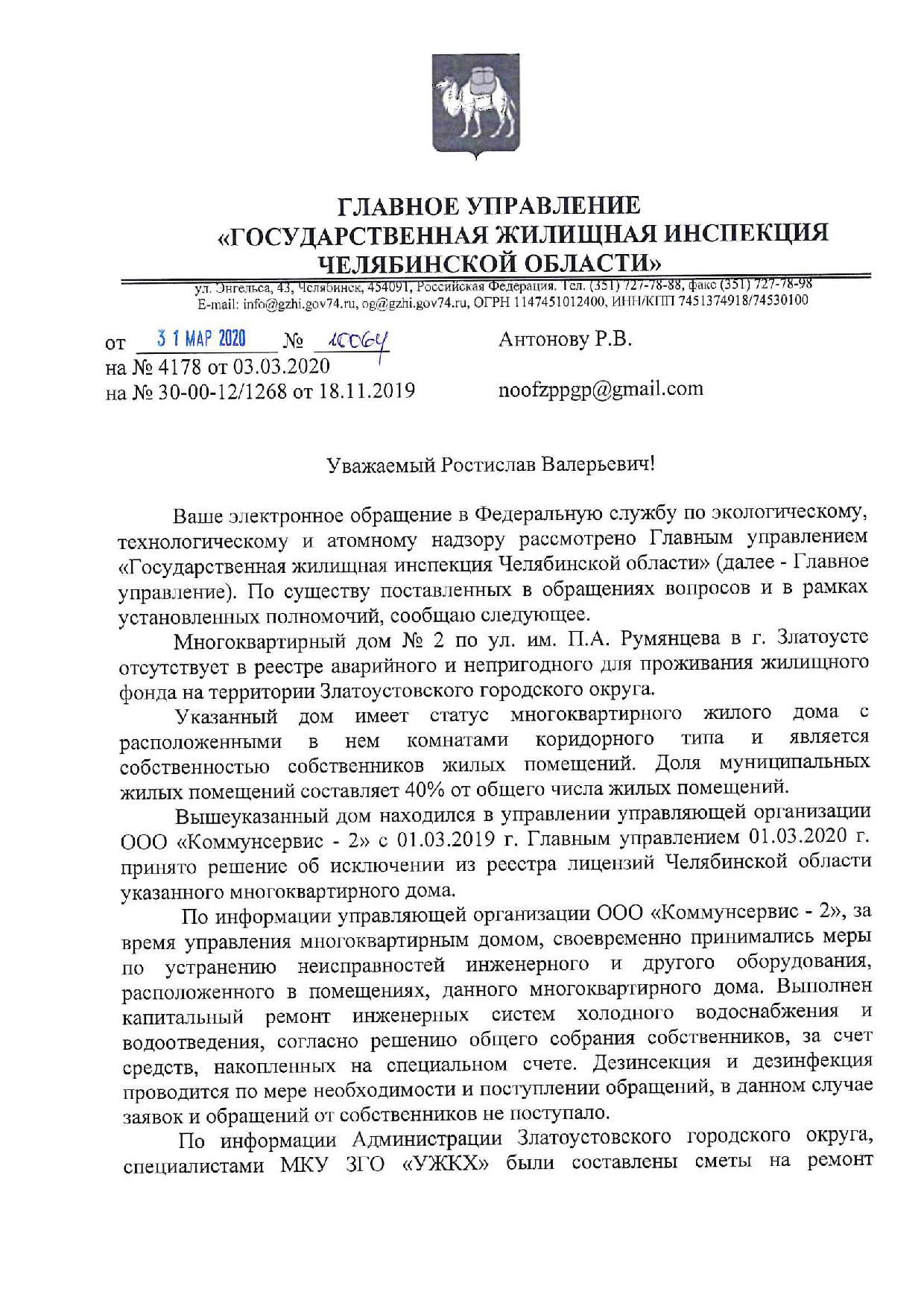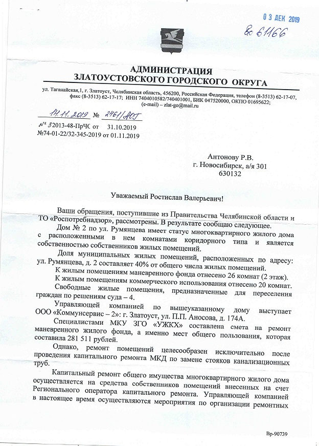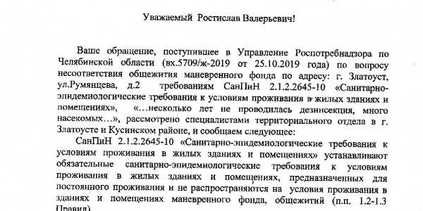 Номер жалобы:61166 Тип жалобы:Иные проблемы ЖКХ Название объекта: Регион:Челябинская область Город:Златоуст Адрес:улица Румянцева, 2 Описание жалобы:В Златоусте на ул. Румянцева, дом 2 жители кричат о помощи. Вот такой маневренный фонд в общежитии. В их доме комнаты зарастают в грибке, одолевают блохи. 1 марта в общежитии убрали вахту, а первый этаж превратился в общественный туалет. А по вечерам здесь собираются незванные гости, чтобы сходить в туалет и употребить. В доме живут пенсионеры и многодетные мамы. Статус: