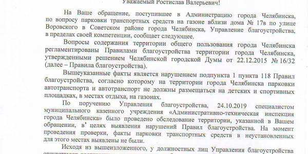 Номер жалобы:61193 Тип жалобы:Иные проблемы ЖКХ Название объекта: Регион:Челябинская область Город:Челябинск Адрес:улица Воровского, 17В Описание жалобы:Парковка на газоне Статус: