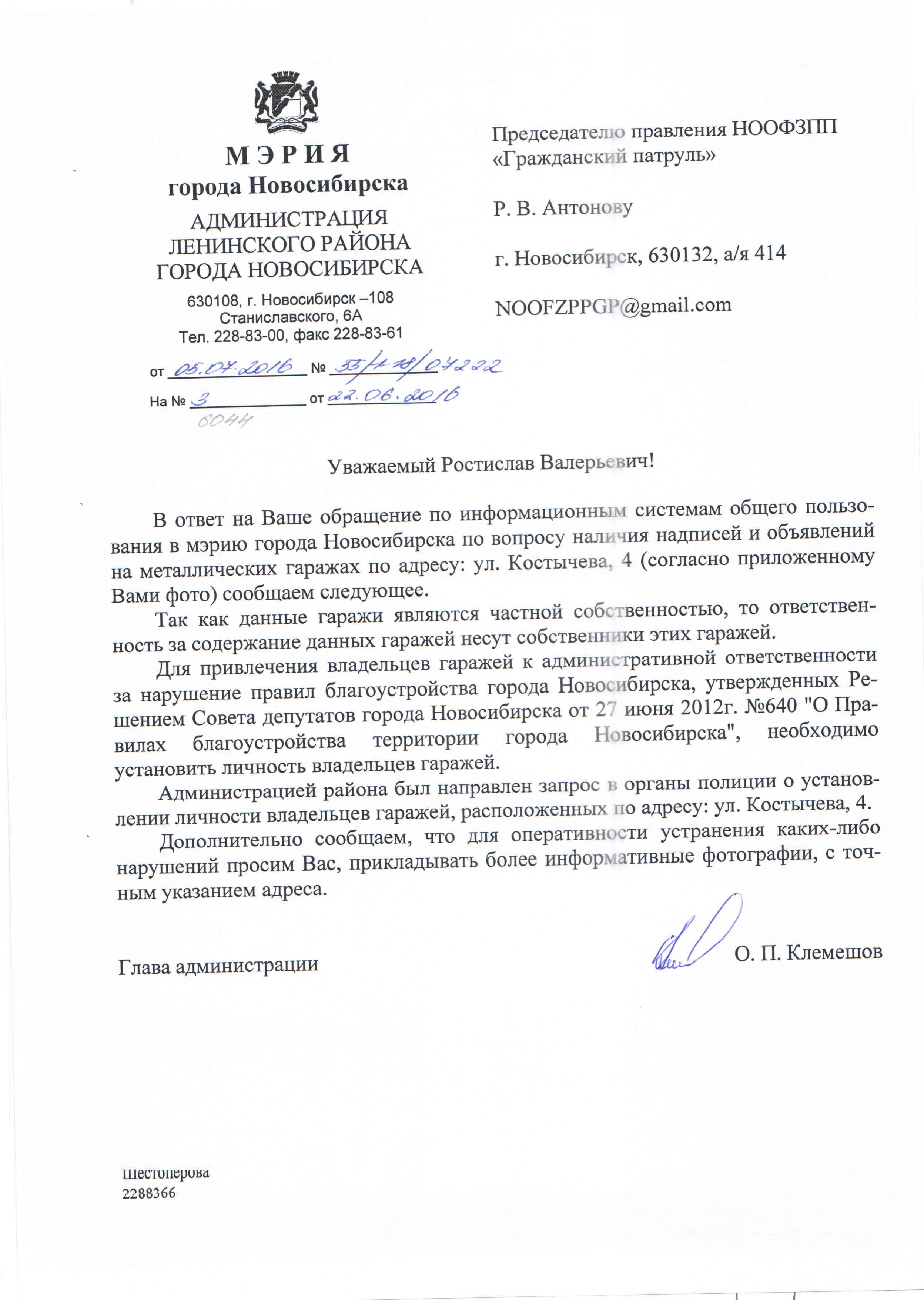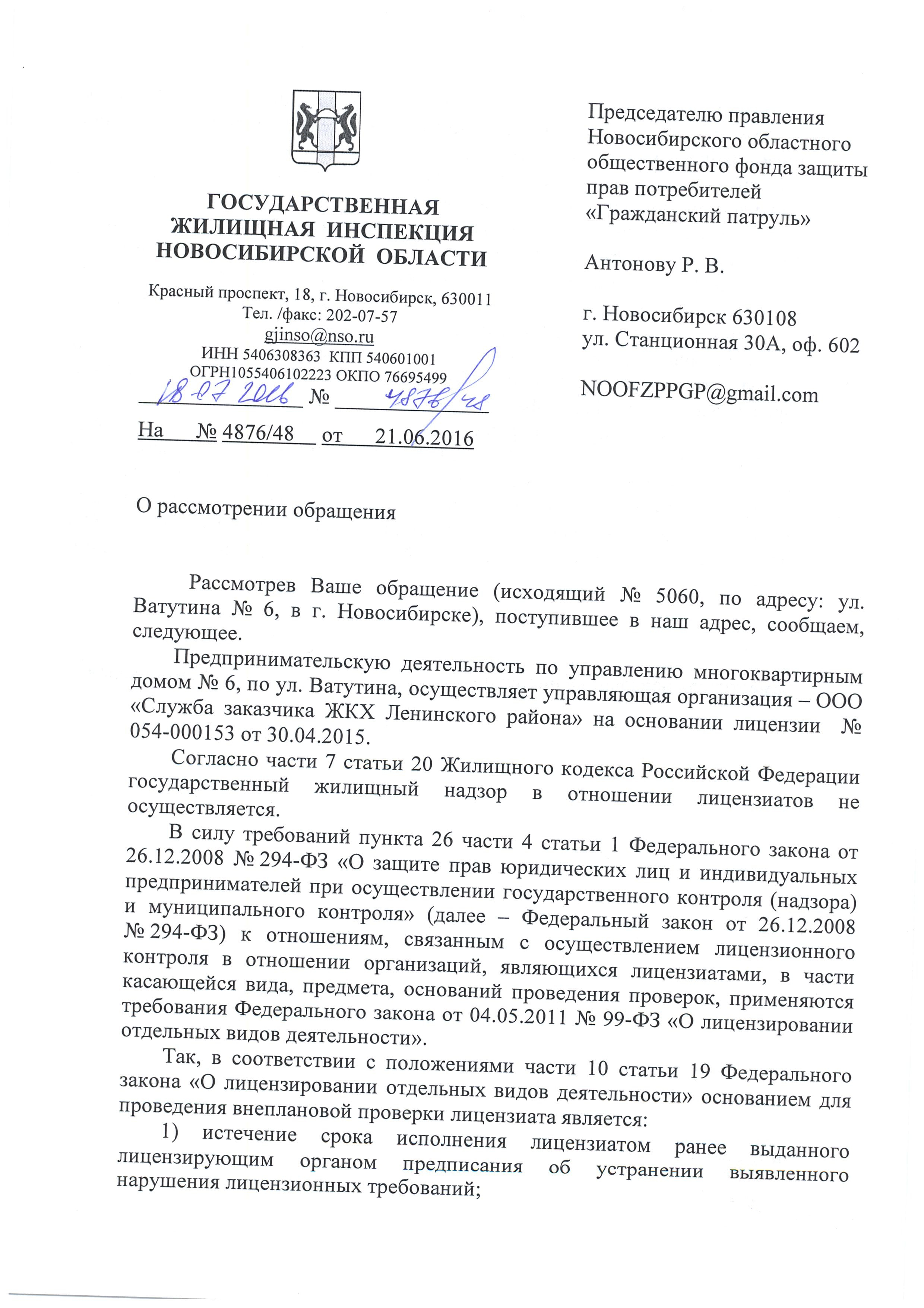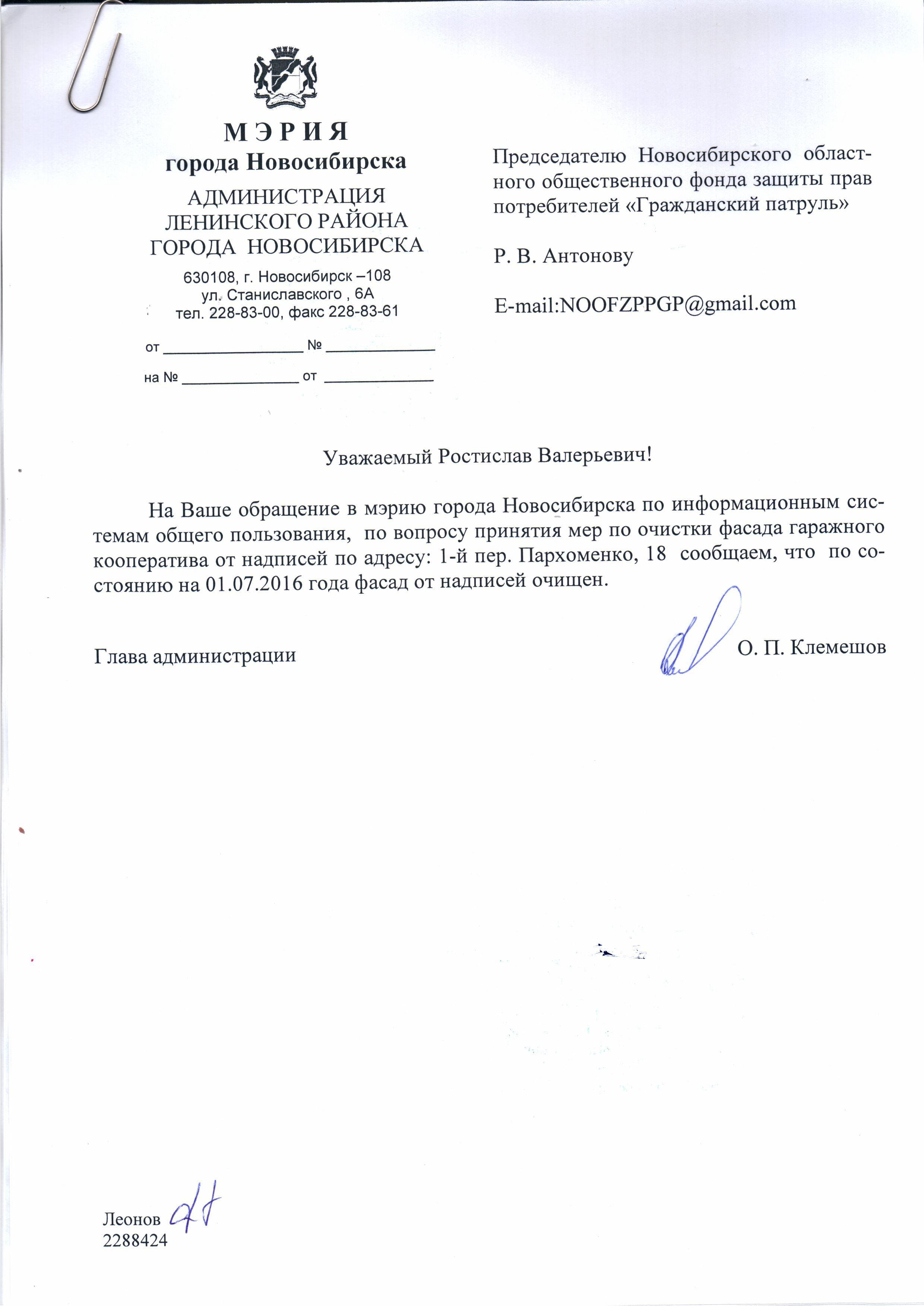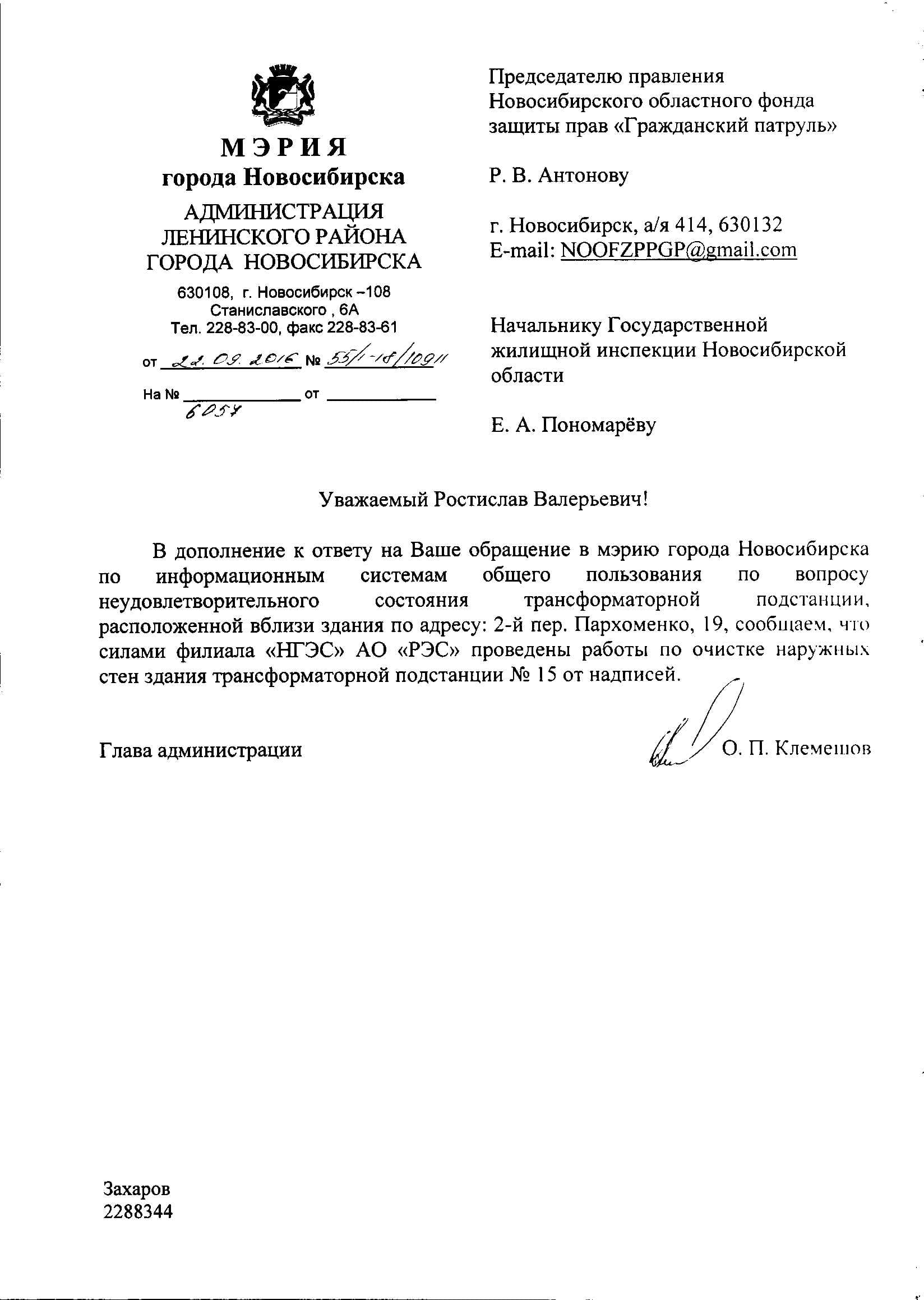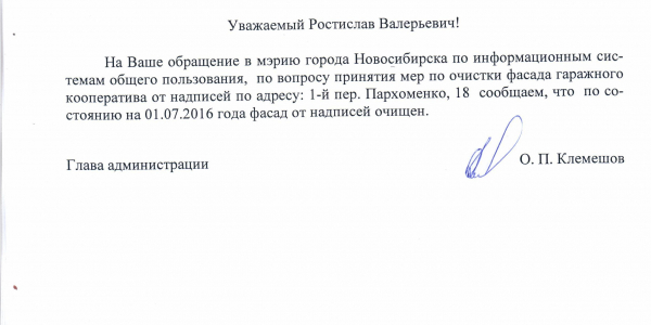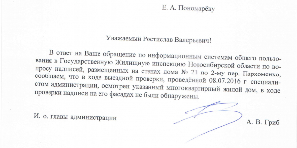 Номер жалобы:6058 Тип жалобы:Иные проблемы ЖКХ Название объекта:Управляющая Компания Регион:Новосибирская область Город:Новосибирск Адрес:2 переулок Пархоменко, 21 Описание жалобы:Надписи Статус: