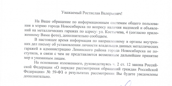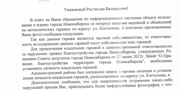 Номер жалобы:6044 Тип жалобы:Иные проблемы ЖКХ Название объекта:Управляющая Компания Регион:Новосибирская область Город:Новосибирск Адрес:ул. Костычева, 6 Описание жалобы:Надписи и объявления в неположенных местах Статус: