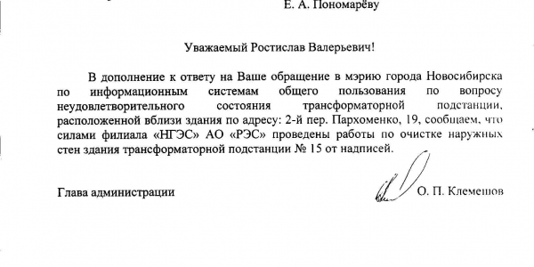 Номер жалобы:6057 Тип жалобы:Иные проблемы ЖКХ Название объекта:Управляющая Компания Регион:Новосибирская область Город:Новосибирск Адрес:2 переулок Пархоменко, 19 Описание жалобы:Надписи на трансформаторной будке Статус: