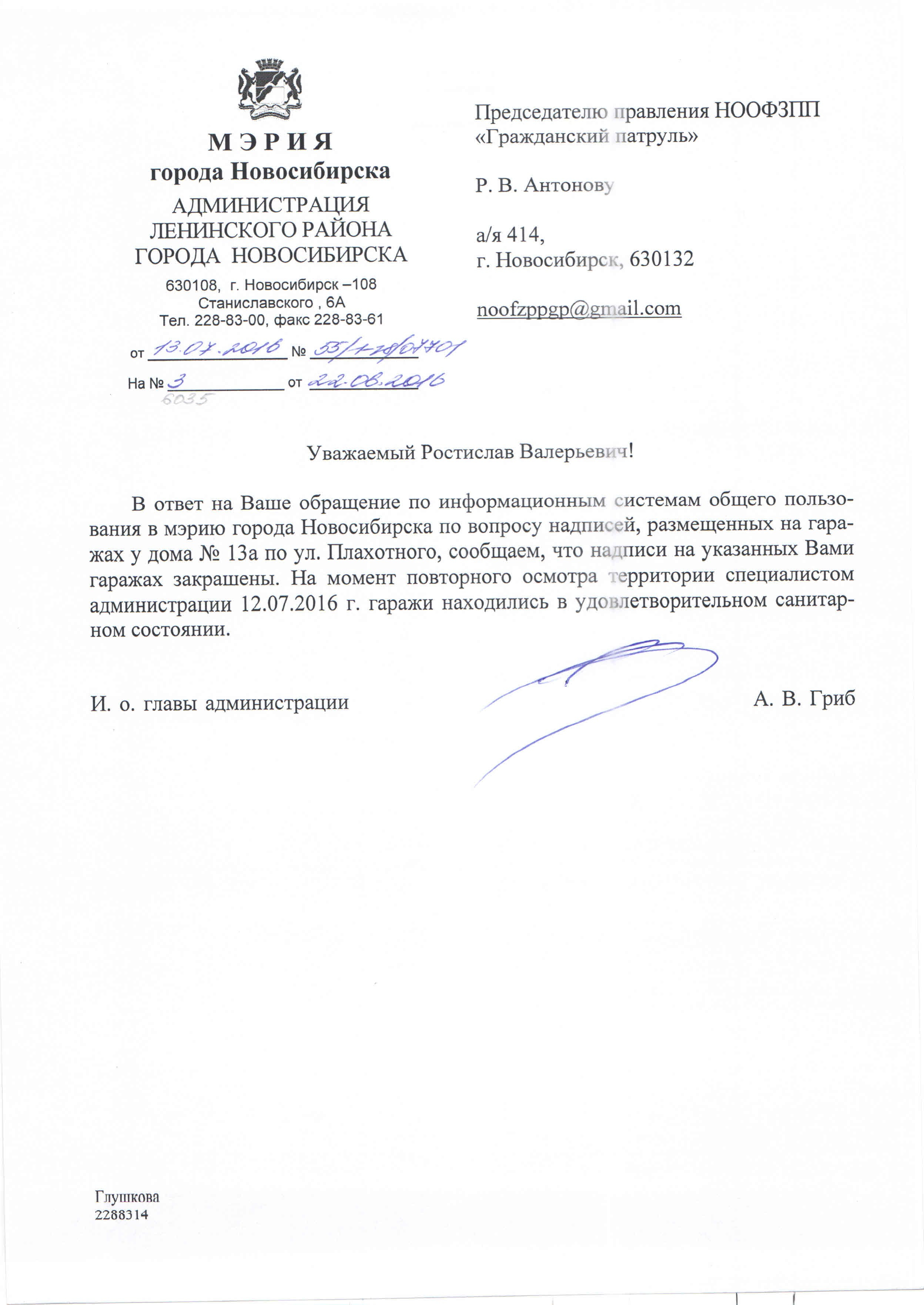 Номер жалобы:6029 Тип жалобы:Иные проблемы ЖКХ Название объекта:Управляющая Компания Регион:Новосибирская область Город:Новосибирск Адрес:ул. Серафимовича, 1/4 Описание жалобы:Надписи на гаражах Статус: