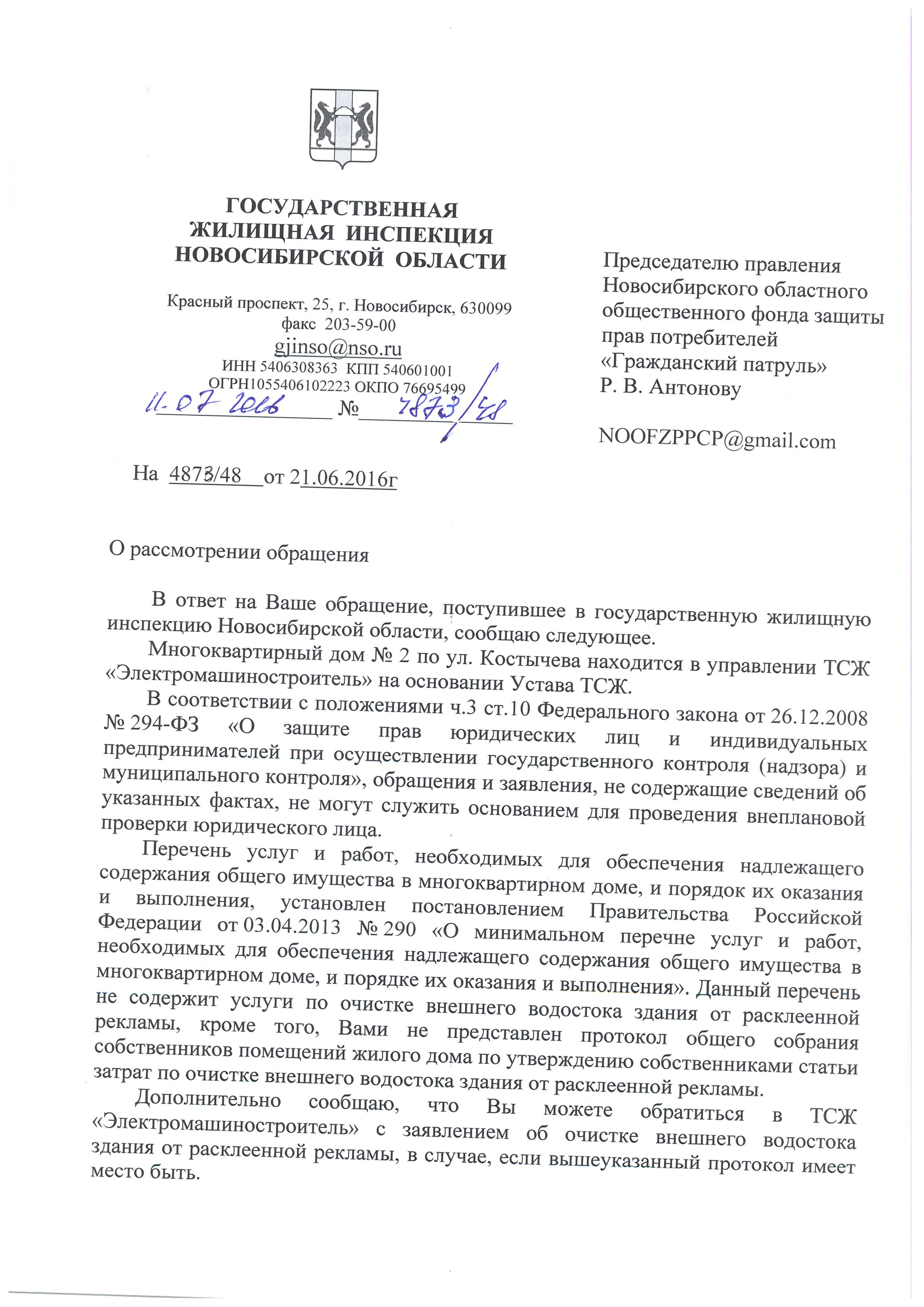 Номер жалобы:6042 Тип жалобы:Иные проблемы ЖКХ Название объекта:Управляющая Компания Регион:Новосибирская область Город:Новосибирск Адрес:ул. Костычева, 2 Описание жалобы:Надписи на доме Статус: