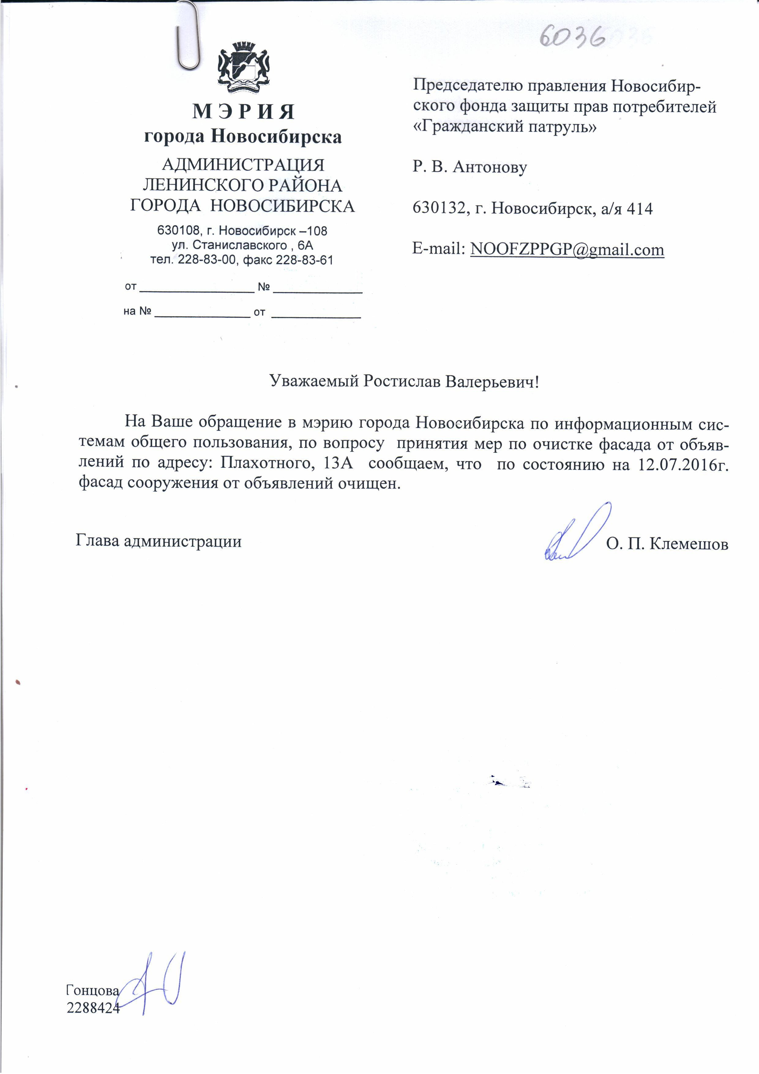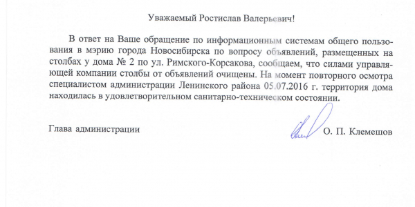 Номер жалобы:6026 Тип жалобы:Иные проблемы ЖКХ Название объекта:Управляющая Компания Регион:Новосибирская область Город:Новосибирск Адрес:ул. Римского-Корсакова, 2 Описание жалобы:Расклейка объявлений в неположенном месте Статус: