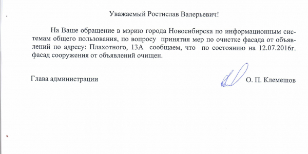 Номер жалобы:6036 Тип жалобы:Иные проблемы ЖКХ Название объекта:Управляющая Компания Регион:Новосибирская область Город:Новосибирск Адрес:ул. Плахотного, 13А Описание жалобы:Расклейка объявлений в неположенном месте Статус: