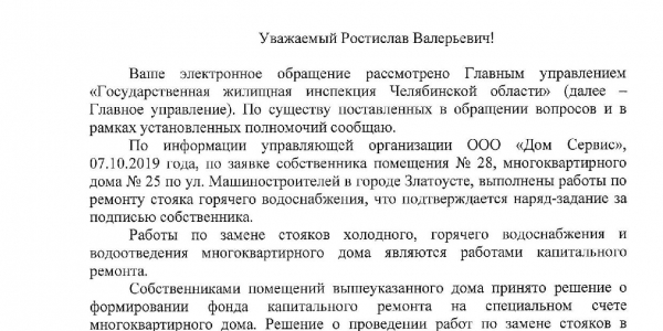 Номер жалобы:61059 Тип жалобы:Иные проблемы ЖКХ Название объекта: Регион:Челябинская область Город:Златоуст Адрес:улица Машиностроителей, 25 Описание жалобы:Добрый день. У нас огромное ЧП в многоквартирном доме ,машиностроителей 25 второй подъезд, так получилось что эти дома строили так ,что трубы горячей и холодной воды замурованы в стены дома (шлакоблок обложен песком, и с каждым потопом это все мокнет и разваливается) , это бомба замедленного действия, живем на пороховой бочке( дом 60 годов, трубы относятся к управляющей компании, но они сказали что наш дом не рентабельный для них, им не выгодно держать нас на балансе и обслуживать- качество обслуживания дома, ремонт капитальный ремонт тут вообще никогда не делали.) все стояки канализации, все трубы водопроводные в аварийном состоянии. В моей квартире батареи отопительные еще со времен постройки дома-как мне известно управляющая компания тоже их заменяет.К кому обратиться чтобы их заменить? И так к чему все это, в понедельник у меня в 28 квартире рванула та самая замурованная труба, которая является обще домовой-испещрена была трещинами- уже 4 раз варили до моей покупки,я 5 раз столкнулась с этой бедой- и уже который раз соседку топит внизу, со стороны лестничной клетки стена сырая и огромное пятно, повезло что еще совсем не развалилась, но песок со стороны ванны отваливается, а со стороны лестничной клетки пустота от влаги и набухшая известка с тем же песком) Впереди зима и морозы, в любой момент эти трубы и канализация(прорывало тоже много раз) и могут рвануть хоть где. у нас 4 этажа, живем как на вулкане. я вообще погорелец,у меня с мамой в 13 году сгорел дом, квартиру нам не предоставили. Пришлось взять ипотеку квартиру за небольшую сумму но в плохом состоянии. на сколько хватило сил и средств бы. . Теперь прибавились и коммунальные аварийные проблемы.Впереди зима и морозы. Очень страшно жить в таком доме, не известно что завтра прорвет и где. Как и у кого попросить помощи чтобы меня услышали? Прошу содействия в наше беде. нужно отрезать эти замурованные трубы с подвала , и вывести оттуда наружу новые. И заменить стояки канализации, мы устали жить в потопах. Каждый раз делать ремонт нам материально не возможно, у нас в основном пенсионеры живут. И семьи с маленькими детьми. Слезно прошу, помогите чем сможете. все жильцы этого подъезда Устали жить в сырости ,в потопах, в запахе от канализации. Статус: