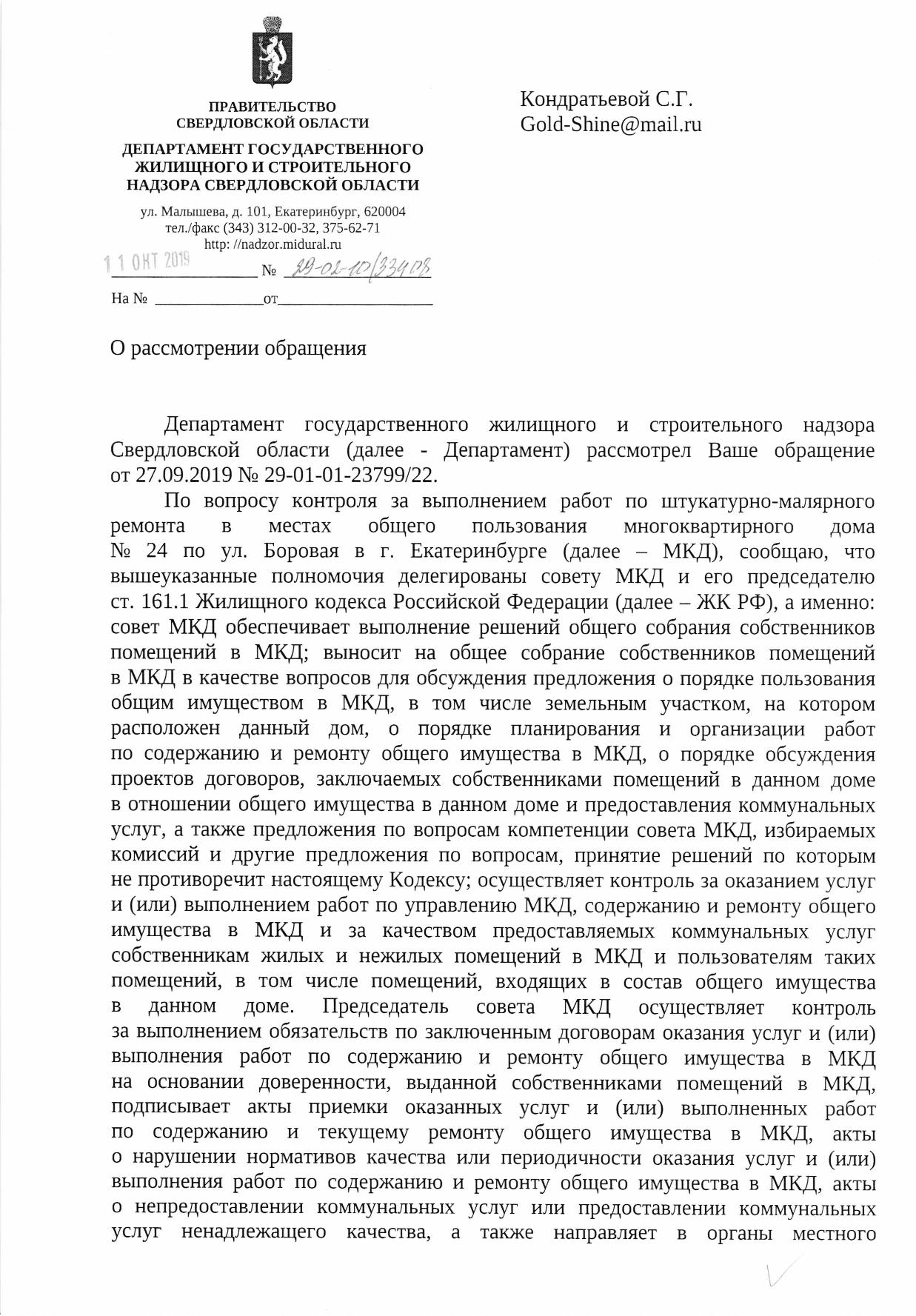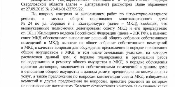 Номер жалобы:60621 Тип жалобы:Иные проблемы ЖКХ Название объекта: Регион:обл. Свердловская Город:Екатеринбург Адрес:Боровая улица, 24 Описание жалобы:качество произведённого ремонта в подъезде на Ул. Боровая 24 Статус:
