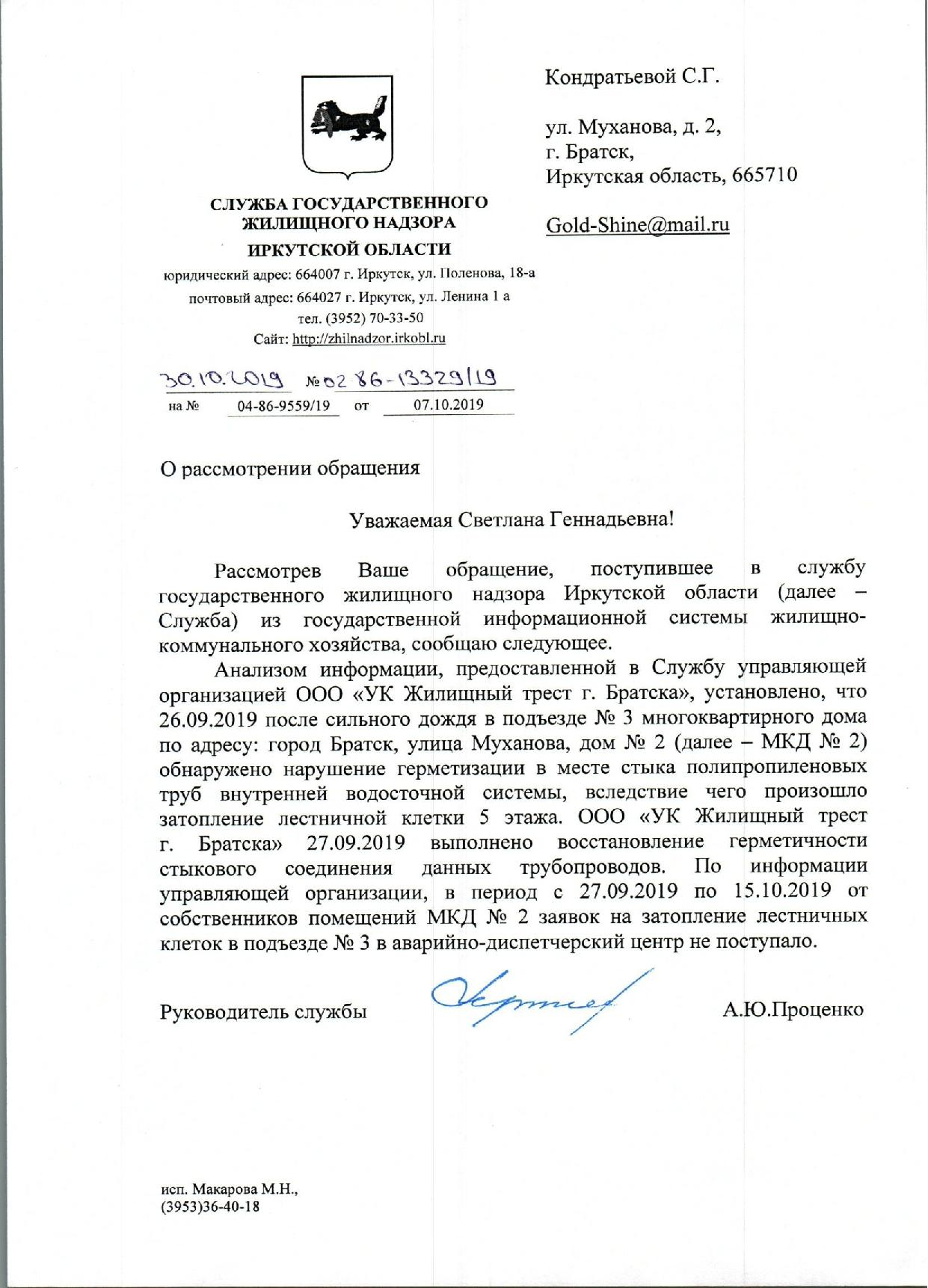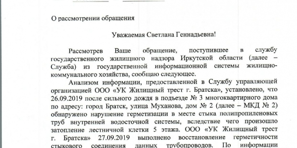 Номер жалобы:60657 Тип жалобы:Иные проблемы ЖКХ Название объекта: Регион:Иркутская область Город:Братск Адрес:улица Муханова, 2, подъезд 3 Описание жалобы:Нас топит. Вода льёт с 5 этажа,крыша течет снова то ли трубу прорвало. В августе обращались в управление с этим же вопросом, обещали сделать но так и не починили. Вода уже в квартирах в некоторых. Статус: Вложенные файлы: