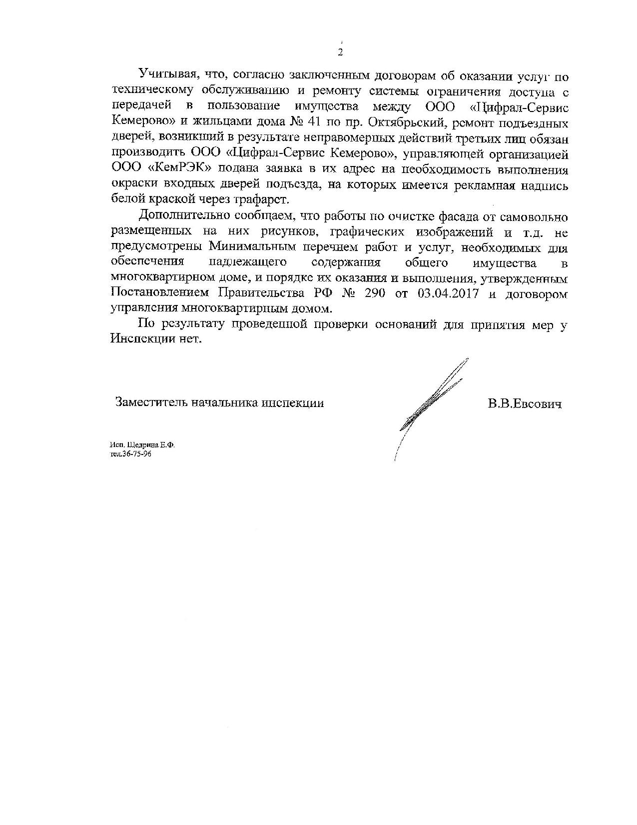 Номер жалобы:58900 Тип жалобы:Иные проблемы ЖКХ Название объекта: Регион:Кемеровская область Город:Кемерово Адрес:Пионерский бульвар, 14 Описание жалобы:ГЖИ Разрушения козырька подъезда и надписи на дверях подъезда Статус: