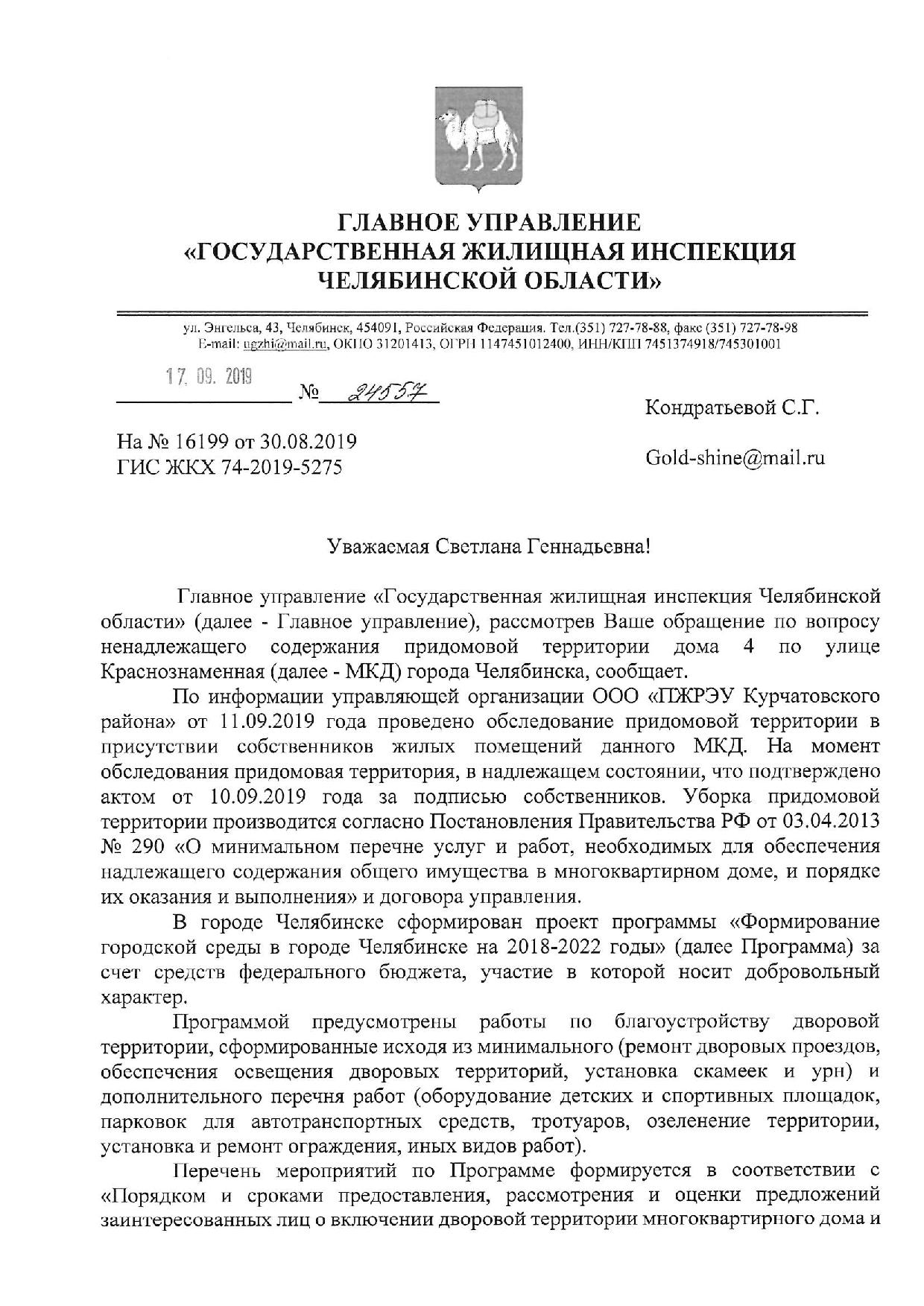 Номер жалобы:59135 Тип жалобы:Иные проблемы ЖКХ Название объекта: Регион:Челябинская область Город:Челябинск Адрес:Краснознамённая улица, 4 Описание жалобы:Во дворе отсутствует детская площадка, двор в ненадлежащем состоянии Статус: