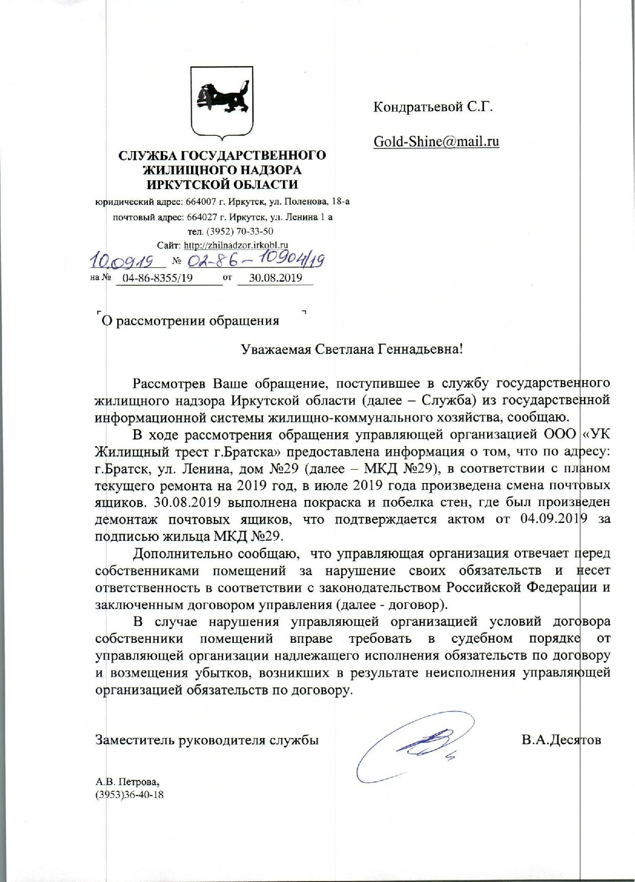 Номер жалобы:59154 Тип жалобы:Иные проблемы ЖКХ Название объекта: Регион:Иркутская область Город:Братск Адрес:проспект Ленина, 29 Описание жалобы:После замены почтовых ящиков,ремонт подъезда не восстановлен Статус: