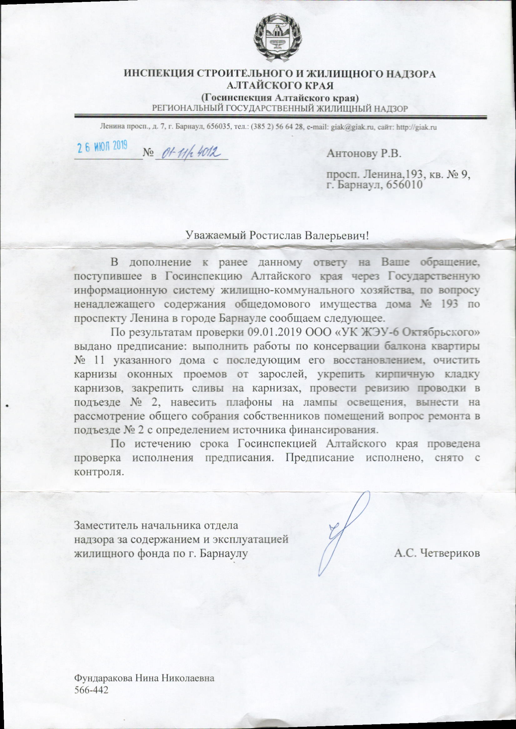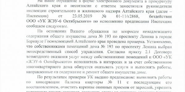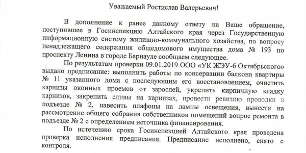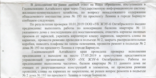 Номер жалобы:58574 Тип жалобы:Иные проблемы ЖКХ Название объекта:ООО "УК ЖЭУ-6 Октябрьского" Регион:Алтайский край Город:БАРНАУЛ Адрес:пр-т Ленина, 193 Описание жалобы:10.01.2019 было выдано предписание Госинспекцией Алтайского края на выполнения следующих работ по адресу: г. Барнаул проспект Ленина, 193-9. УК ЖЭУ дожна была выполнить следующие виды работ: Выполнить работы по косервации балкона квартиры №11 с последующим его восстановлением, очистить карнизы оконных проемов от зарослей, укрепить кирпичную кладку карнизов.ю закрепить сливы на карнизах, произвести ревизию проводки в подъезде, закрыть распред.коробки, навесить плафоны на лампы освещения, произвести ремонт в подъезде. Из всего выше перечисленного было сделано: разобран балкон без восстановления , навешаны плафоны. Больше ничего сделано не было.
