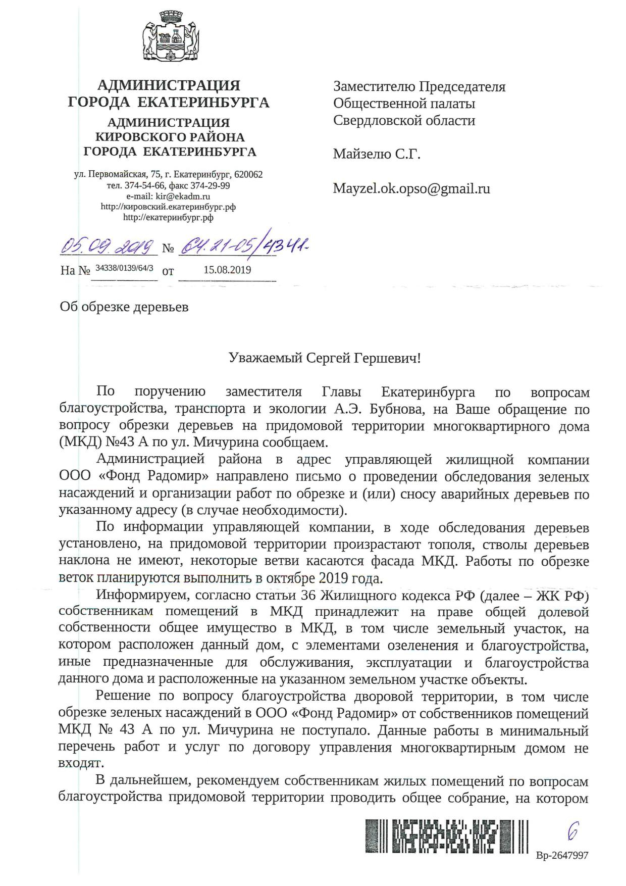 Номер жалобы:58575 Тип жалобы:Иные проблемы ЖКХ Название объекта: Регион:Свердловская область Город:Екатеринбург Адрес:улица Мичурина, 43А Описание жалобы:Тополя во дворе все заражены тополиной тлей. Есть риск быстрого вымирания и падения на жителей ! Необходима срочная обрезка или полный спил ! Статус: