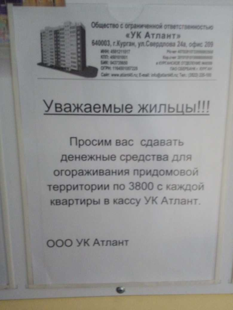 Номер жалобы:58196 Тип жалобы:Иные проблемы ЖКХ Название объекта: Регион:Курганская область Город:Курган Адрес:улица Алексеева, 16В Описание жалобы:Управляющая компания "Атлант"собирала средства на ограждение территории домов по адресу ул.Алексеева 16 в. и дом г. без сметы и разрешения выставили сумму 3800,провели голосование,большинство собственников были за ограждение,но за три дня до окончания сбора средств отказались в помощи собственникам,мотевирую тем,что им это не надо Статус: