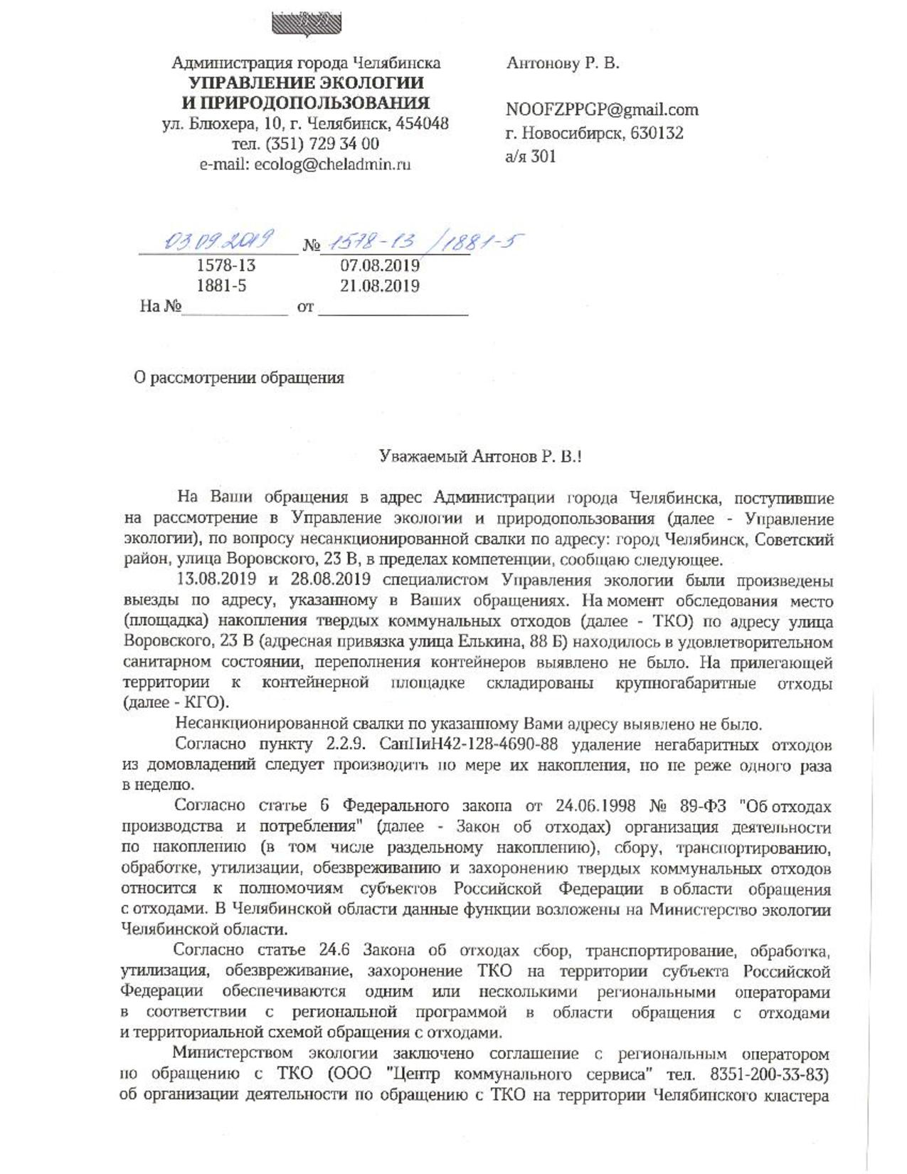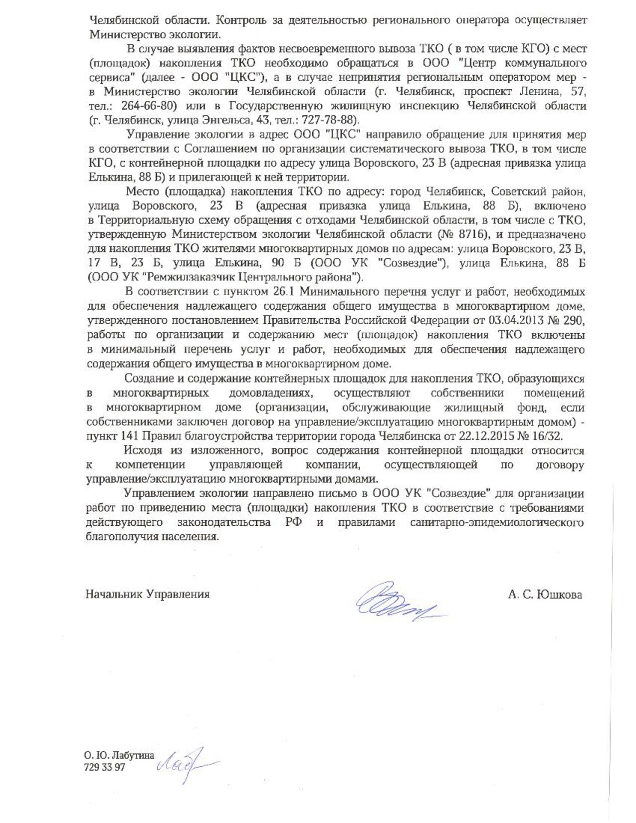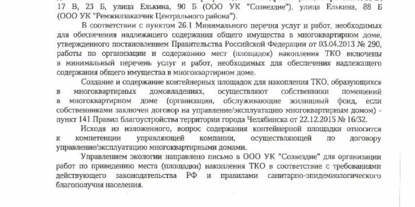 Номер жалобы:58240 Тип жалобы:Иные проблемы ЖКХ Название объекта: Регион:Челябинская область Город:Челябинск Адрес:улица Воровского, 23В Описание жалобы:Несанкционированная свалка мусора рядом с контейнерной площадкой. Статус: