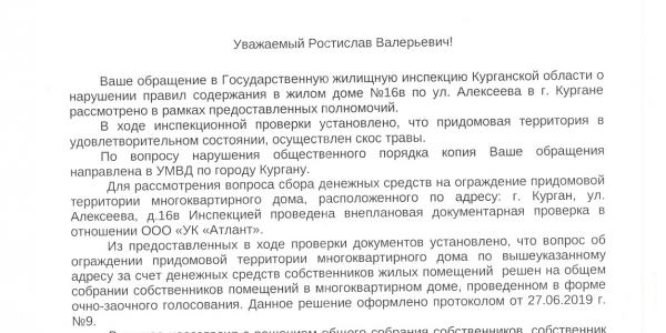 Номер жалобы:58194 Тип жалобы:Иные проблемы ЖКХ Название объекта: Регион:Курганская область Город:Курган Адрес:улица Алексеева, 16В Описание жалобы:Управляющая компания "Атлант". Не косят траву на территории дома по адресу город Курган ул.Алексеева 16 в.Игнорируют Статус: