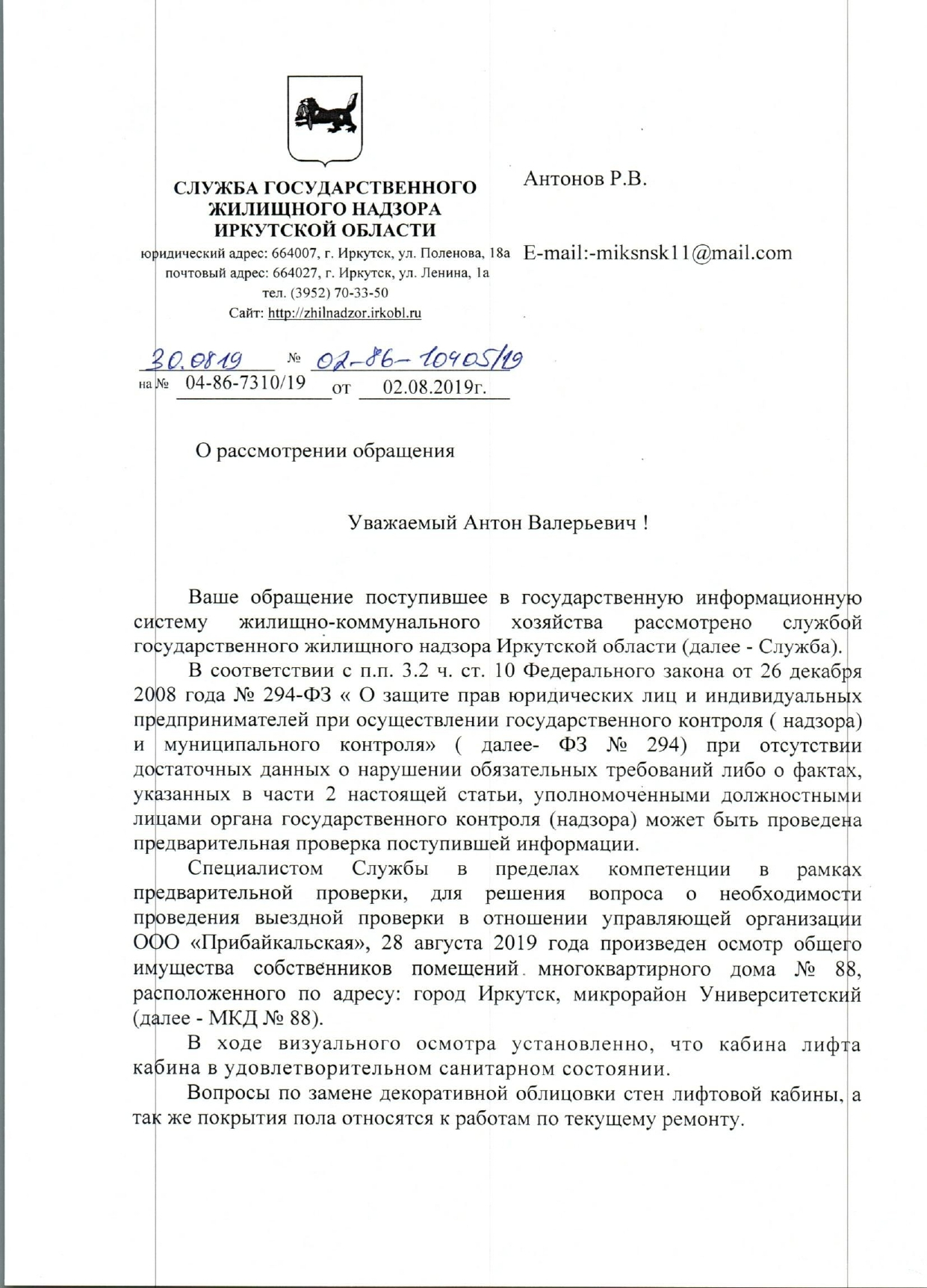 Номер жалобы:57879 Тип жалобы:Иные проблемы ЖКХ Название объекта: Регион:Иркутская область Город:Иркутск Адрес:Иркутск, микрорайон Университетский, 88 Описание жалобы:Иркутск, мкр. Университский дом 88, подъезд 1 !!!(обязательно укажите про подъезд номер 1, а то в прошлый раз другие подъезды проверяли, если не указать)!!! Здравствуйте! УК "ООО"Прибайкальская" , не реагирует на обращение жителей дома. Дело в том, что УК не моет лифт, стены, двери лифта как внутри, так и снаружи на каждом этаже грязные. Кроме того двери облезли, пол внутри надорван, стены изрисованы и облезли. Прошу помочь и заставить УК привести лифт в порядок, отмыть весь, а не только пол! Да и покрасить либо обшить новыми материалами. Статус: