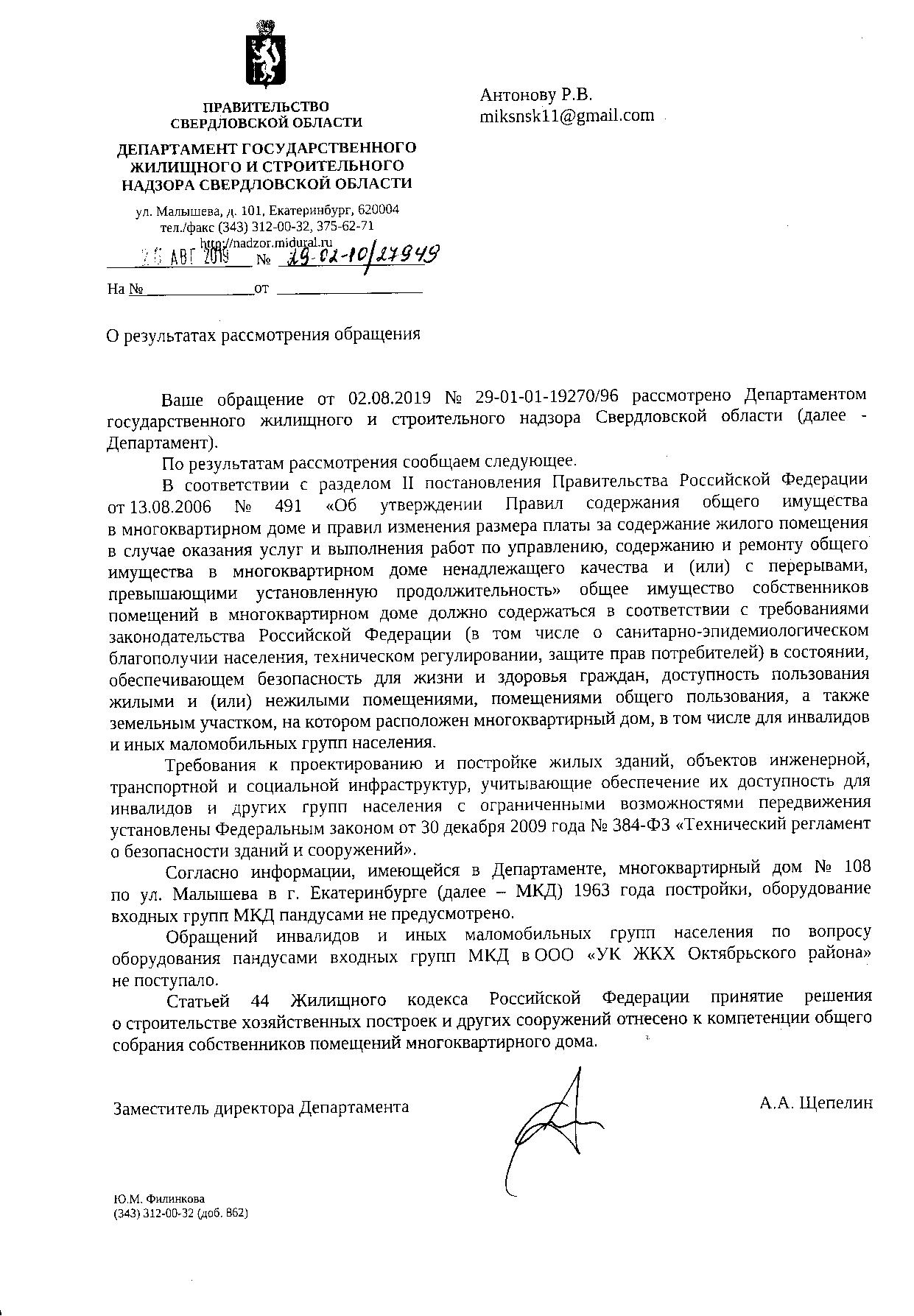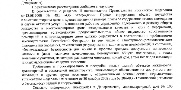 Номер жалобы:57928 Тип жалобы:Иные проблемы ЖКХ Название объекта: Регион:Свердловская область Город:Екатеринбург Адрес:улица Малышева, 108 Описание жалобы:Нет пандусов при входе в подъезды жилого дома, расположенного по адресу Малышева, 108.