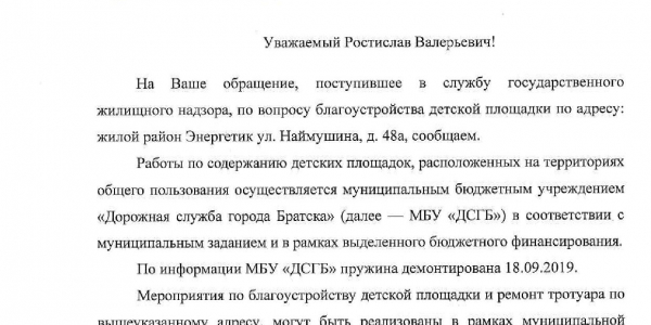 Номер жалобы:58076 Тип жалобы:Иные проблемы ЖКХ Название объекта: Регион:Иркутская область Город:Братск Адрес:улица Наймушина, 48А Описание жалобы:На детской площадки около дороги демонтировали два секции забора, отделяющего площадку от дороги. Теперь дети бегают во время игры через дороги, создавая риск возникновения ДТП. До сих пор управляющей компанией не восстановлена качалка на пружине. Остался только острый оголовок. Тротуар рядом с площадкой частично разрушен. Статус: