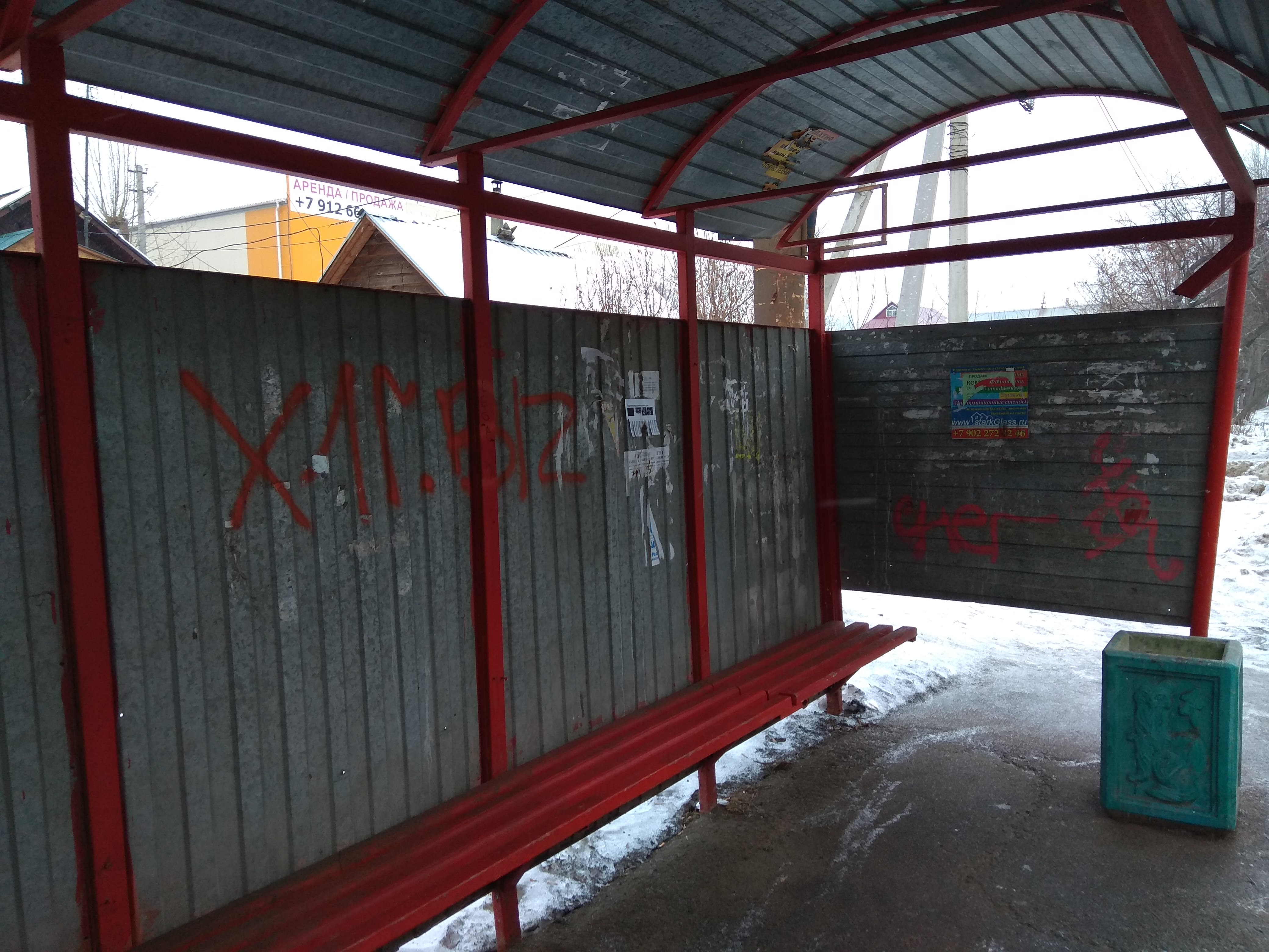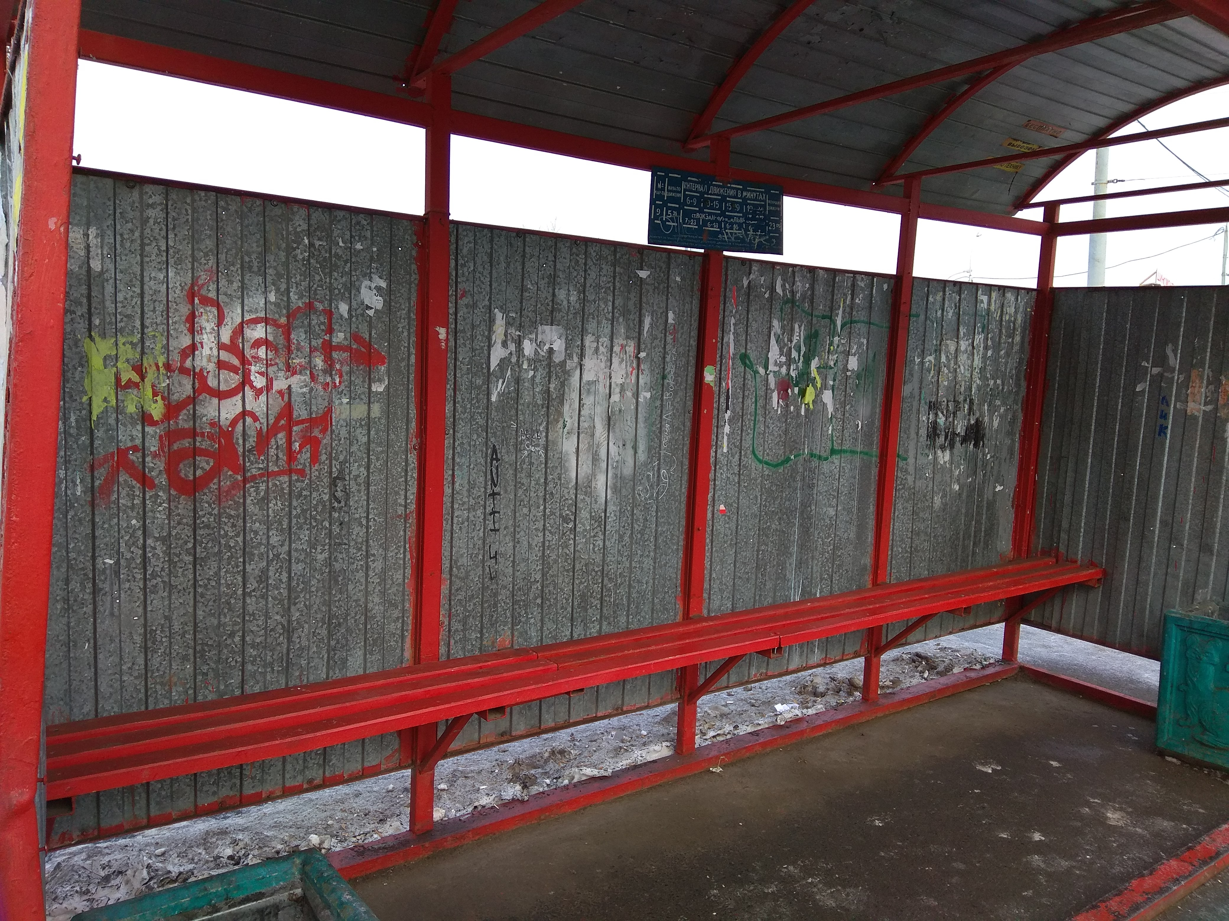 Номер жалобы:39500 Тип жалобы:Ненадлежащее содержание малых архитектурных форм Название объекта:Администрация Екатеринбурга Регион:Свердловская область Город:Екатеринбург Адрес:Самолётная улица, 44 Описание жалобы:На навесе на остановке «Межевая» в сторону остановки «Павлодарская» нанесены граффити и расклеена реклама. Некоторые листы стен навеса не закреплены. Сломана одна доска скамейки. Статус: