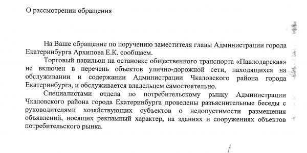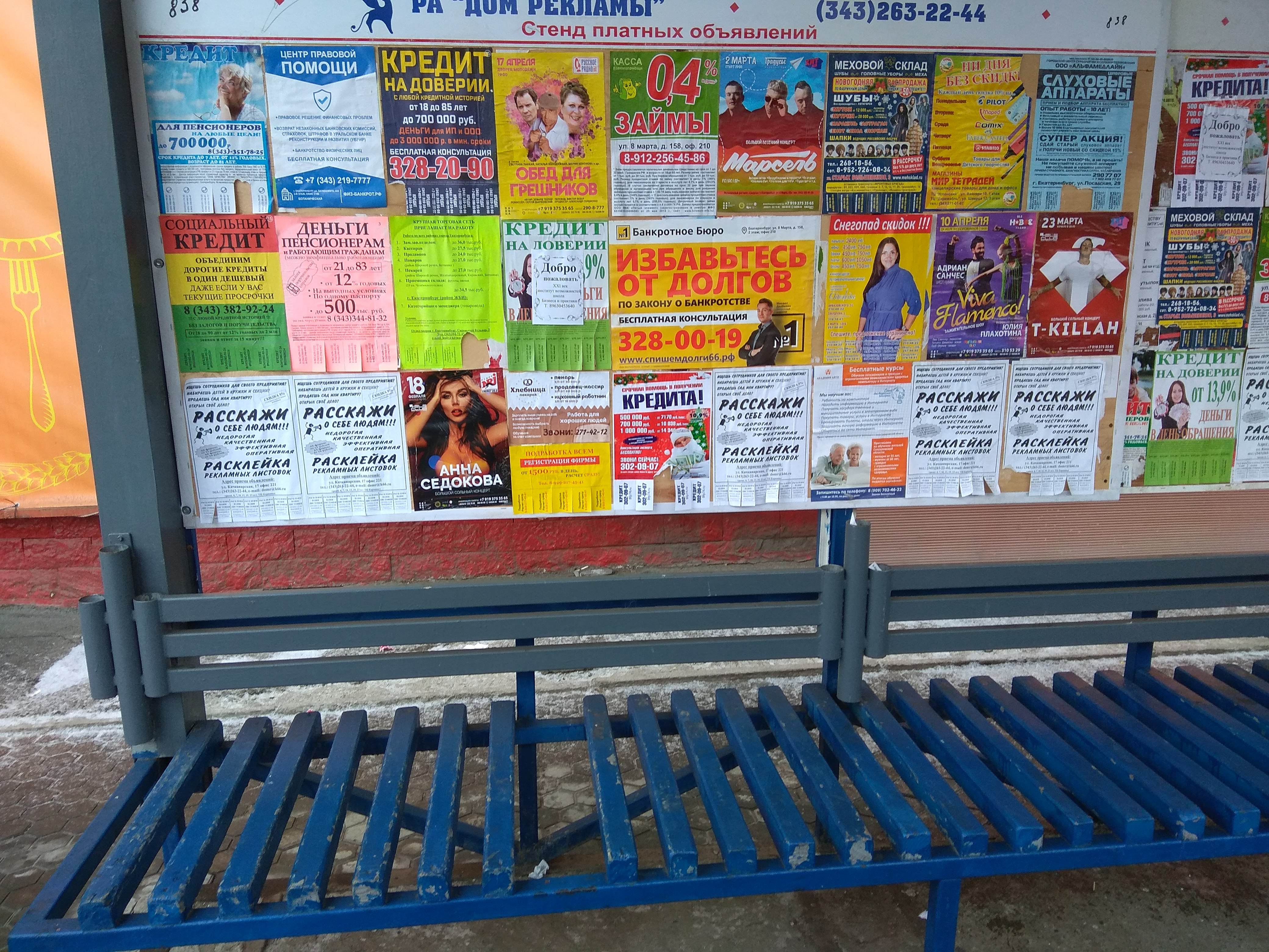 Номер жалобы:39527 Тип жалобы:Ненадлежащее содержание малых архитектурных форм Название объекта:Администрация Екатеринбурга Регион:Свердловская область Город:Екатеринбург Адрес:Самолётная улица, 45 Описание жалобы:Внутри навеса на остановке «Кварцевая» в сторону остановки «Павлодарская» размещены доски объявлений, на колоннах расклеена реклама. Облицовка колонн и, крыши измята, частично удалена, нет части стены. Отсутствуют несколько палок в сидении. Статус: