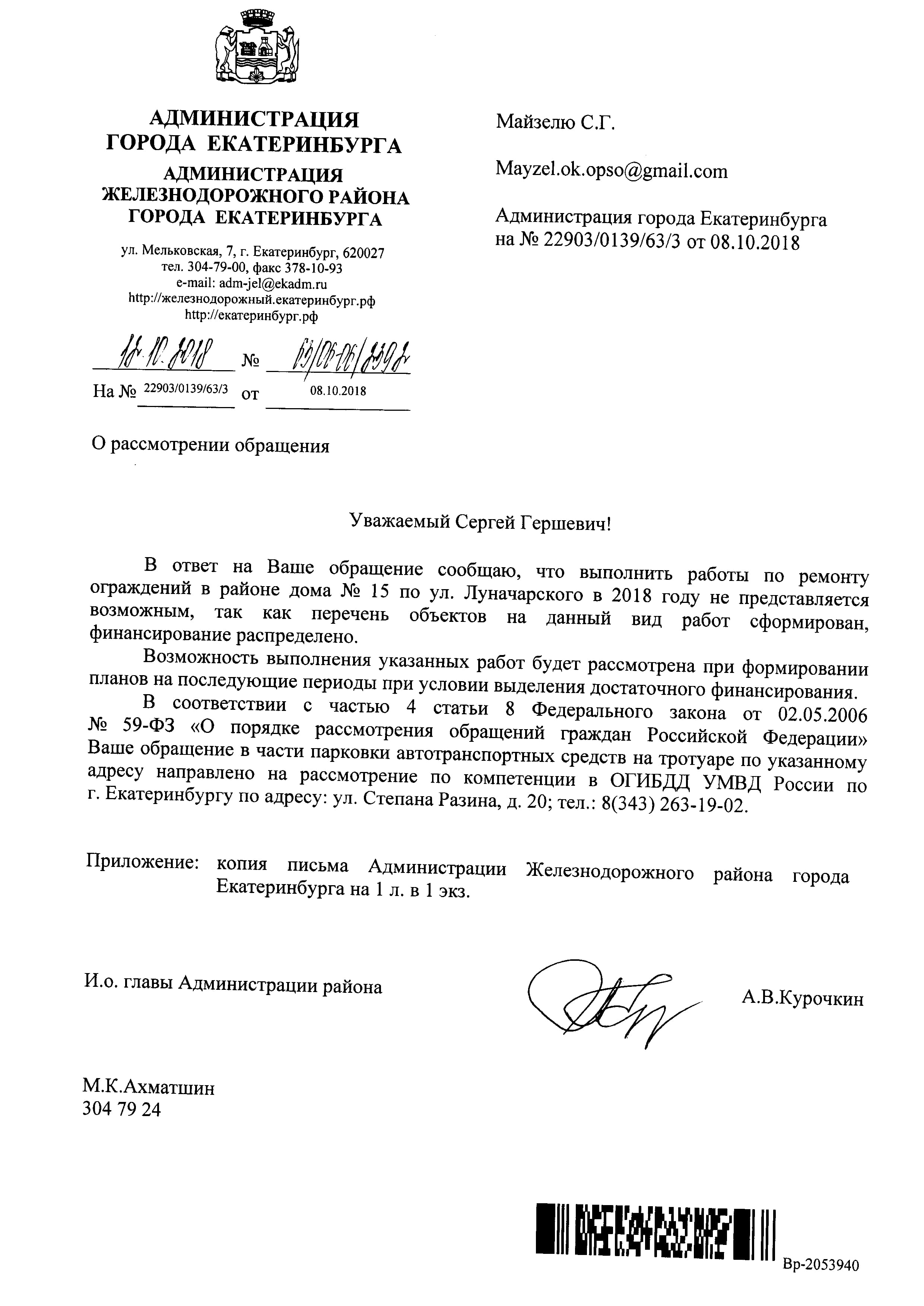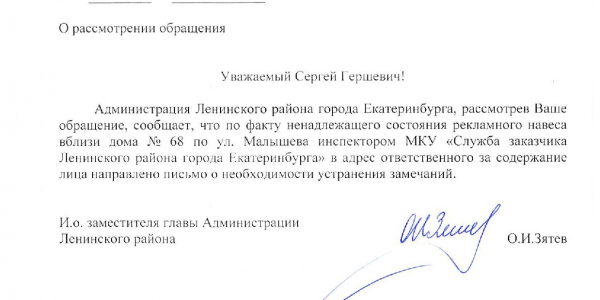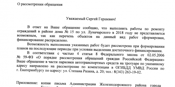 Номер жалобы:42327 Тип жалобы:Ненадлежащее содержание малых архитектурных форм Название объекта:Мэрия Регион:Свердловская область Город:Екатеринбург Адрес:Луначарского, 15 Описание жалобы:Необходимо восстановление ограждения, препятствовавшего выезду автотранспорта с улицы Луначарского на тротуар вдоль улицы Челюскинцев. Статус: