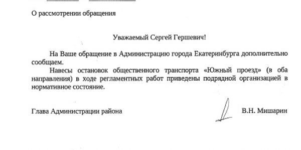 Номер жалобы:39528 Тип жалобы:Ненадлежащее содержание малых архитектурных форм Название объекта:Администрация Екатеринбурга Регион:Свердловская область Город:Екатеринбург Адрес:Самолётная улица, 110 Описание жалобы:Внутри навеса на остановке «Южный проезд» в сторону остановки «Табачная фабрика» нанесены надписи, оставлена доска от рекламного стенда, облезла краска с потолка. Разрушена плита основания навеса. Статус: