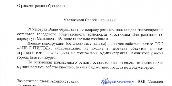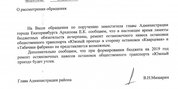 Номер жалобы:39526 Тип жалобы:Ненадлежащее содержание малых архитектурных форм Название объекта:Администрация Екатеринбурга Регион:Свердловская область Город:Екатеринбург Адрес:Самолётная улица, 102 Описание жалобы:На навесе на остановке «Кварцевая» в сторону остановки «Южный проезд» отсутствуют боковые стенки. Статус: