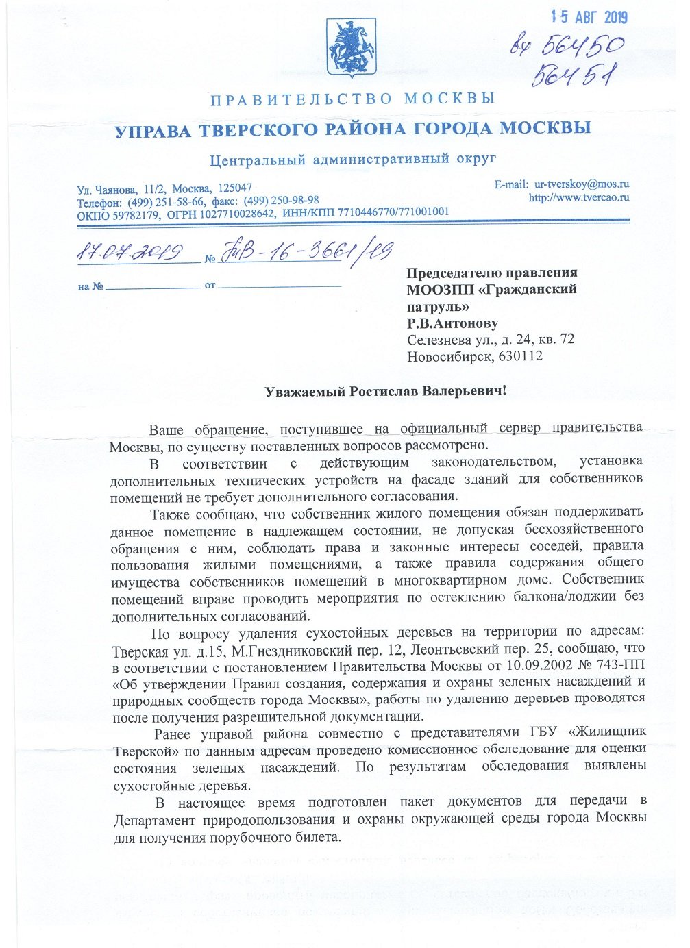Номер жалобы:56450 Тип жалобы:Иные проблемы ЖКХ Название объекта: Регион:Москва Город:Москва Адрес:Малый Гнездниковский переулок, 12 Описание жалобы:Во дворе домов по адресам: Малый Гнездниковский пер., 12, Тверская ул., 15 и Леонтьевский пер., 25 - активисты ГП обнаружили мёртвые и больные деревья. Необходимо срубить мёртвые деревья и вылечить больные, если оно поможет спасению деревьев, а иначе так же срубить. Необходимо произвести компенсационные посадки. Статус: