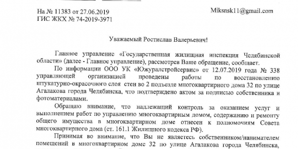 Номер жалобы:56584 Тип жалобы:Иные проблемы ЖКХ Название объекта: Регион:Челябинская область Город:Челябинск Адрес:улица Агалакова, 32 Описание жалобы:После ремонта в подъезде N2 осыпался отделочный слой строительной смеси (штукатурка). Просьба принять меры. Статус: