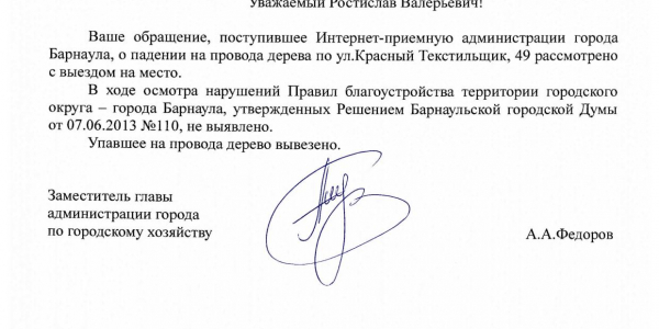Номер жалобы:56687 Тип жалобы:Иные проблемы ЖКХ Название объекта: Регион:Алтайский край Город:Барнаул Адрес:Красный текстильщик, 49 Описание жалобы:По улице Красный текстильщик, 49 упало дерево. На данный момент дерево держится только за счет проходящего кабеля.