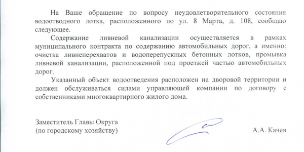 Номер жалобы:56028 Тип жалобы:Иные проблемы ЖКХ Название объекта: Регион:Челябинская область Город:Миасс Адрес:улица 8 Марта, 108 Описание жалобы:Забит ливнесток Статус: