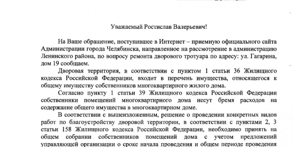 Номер жалобы:56104 Тип жалобы:Иные проблемы ЖКХ Название объекта: Регион:Челябинская область Город:Челябинск Адрес:улица Гагарина, 19 Описание жалобы:1087-9 Во дворе дома по адресу: Гагарина 19, больше года назад при обрезке деревьев грузовиком был раздавлен тротуар. Прошу администрацию провести ремонт тротуара. Статус: