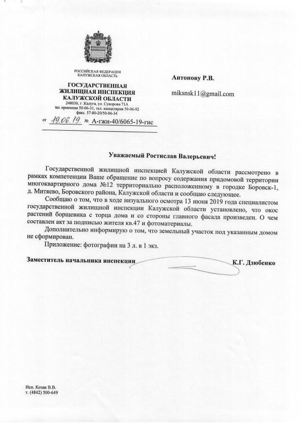 Наро-Фоминск-11/ Боровск-1/ военный городок № 14/ военный городок № 2538Д (Митяево), ближайшего к гаражам и за самим домом вырос борщевик. Жители дома обеспокоены плантациями опасного растения, так как исходя из опыта предыдущих лет борщевик вырастает выше человеческого роста, своими листьями залазит в окна квартир, расположенных на 1-ом этаже и может причинить тяжкий вред здоровью людей. Управляющая компания ООО «ГУЖФ» соответствующих и своевременных мер к его покосу не предпринимает. Военным борщевик параллелен!