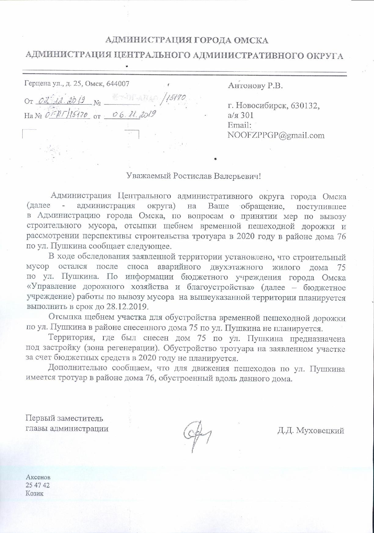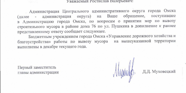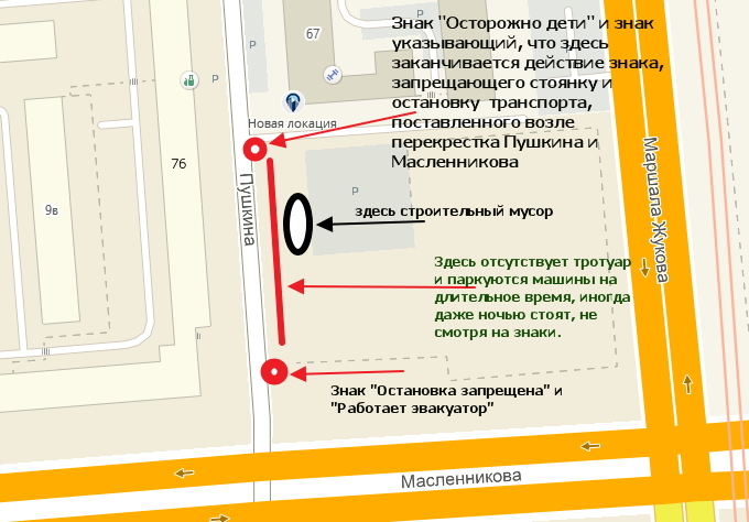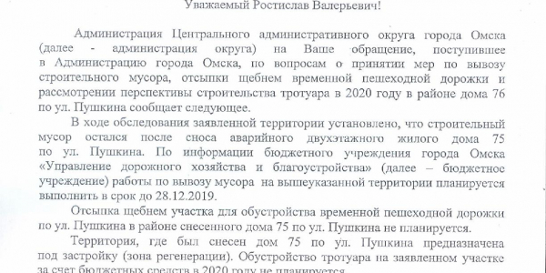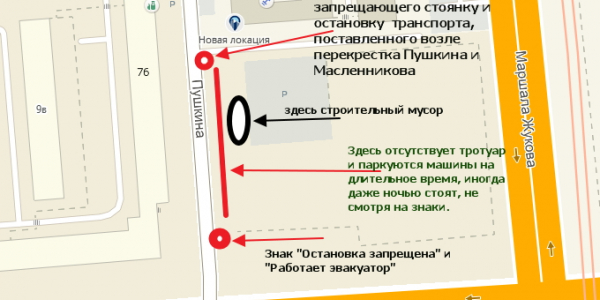 повторюсь: там надо убрать строительный мусор. проконтролировать и наказать нарушителей, которые паркуются не смотря на знак запрета стоянки! и создать там тротуар для пешеходов, чтобы они не ходили по грязи. именно так, слово в слово! место проблемы находится НАПРОТИВ указанного здания, через дорогу по улице Пушкина, у огражденной территории, вдоль ее забора! а этот клоун с какого то перепуга отчитался за территорию и тротуар, что идет именно у указанного здания.