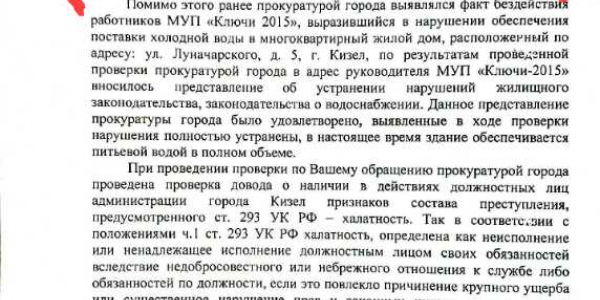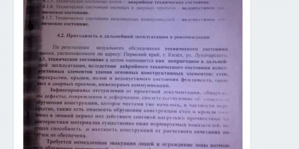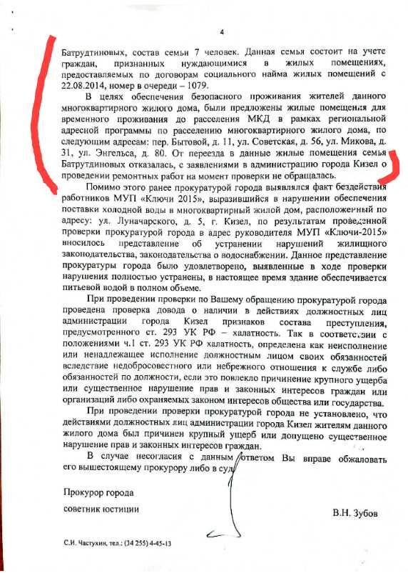Номер жалобы:61735 Тип жалобы:Прочее Название объекта: Регион:Пермский край Город:Кизел Адрес:Кизел, улица Луначарского, 5 Описание жалобы:Жалоба 60169. Заявитель https://m.vk.com/id402026363 утверждает,что в администрацию о просьбе ремонта обращалась,ответили,что жилье непригодно для жилья.(фото2) Прокуратура нам ответила,что данная гражданка не обращалась с данной просьбой вовсе.(фото 1) нужно разобраться в ситуации. Статус: