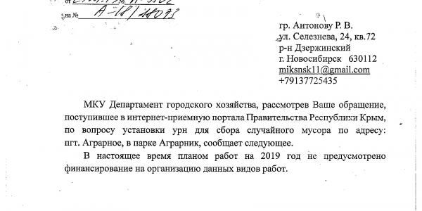 Номер жалобы:61706 Тип жалобы:Прочее Название объекта: Регион:Республика Крым Город:посёлок городского типа Аграрное Адрес:парк Аграрник Описание жалобы:Прошу установить урны в парке Аграрник, должны быть чепез 40 м, а их на километр не видно