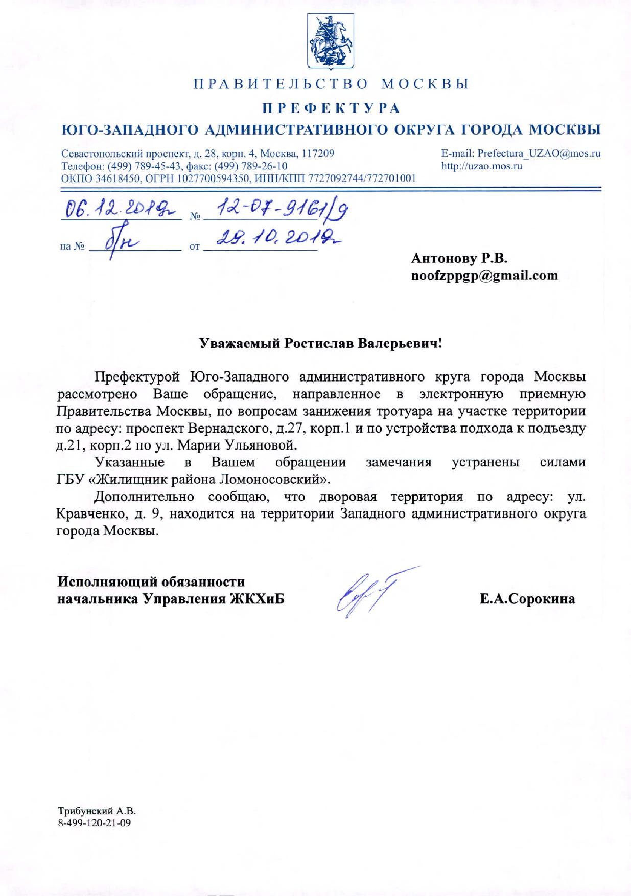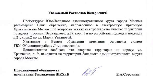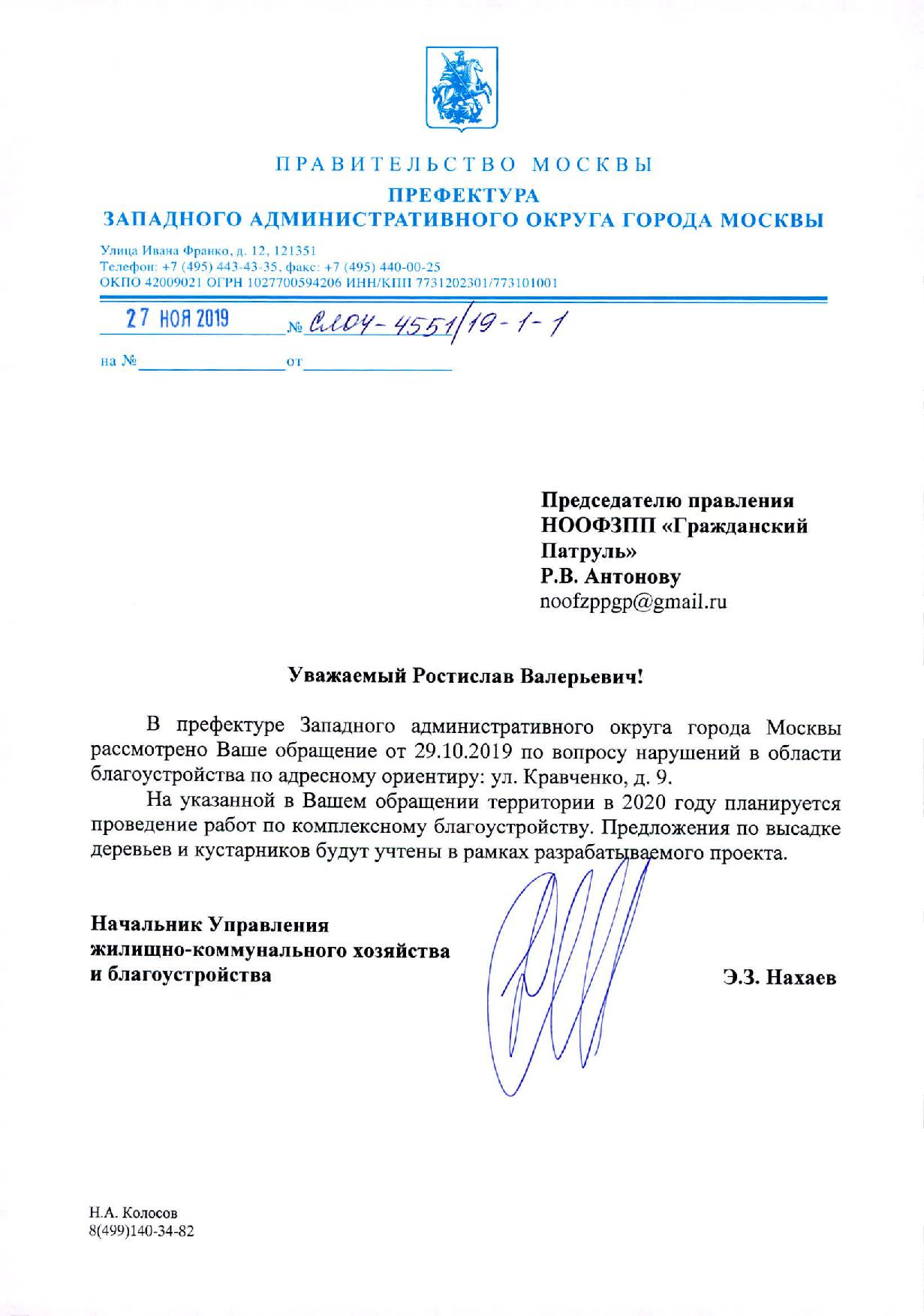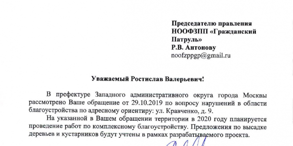 Номер жалобы:61530 Тип жалобы:Прочее Название объекта: Регион:Москва Город:Москва Адрес:улица Кравченко, 9 Описание жалобы:Открытая часть косогора, на котором стоит дом, подвержена оползневым процессам и выветриванию. Существенно ослабить или вовсе остановить их могут посадки деревьев и, главным образом, кустарников, что и следует осуществить. Статус: