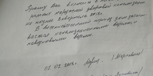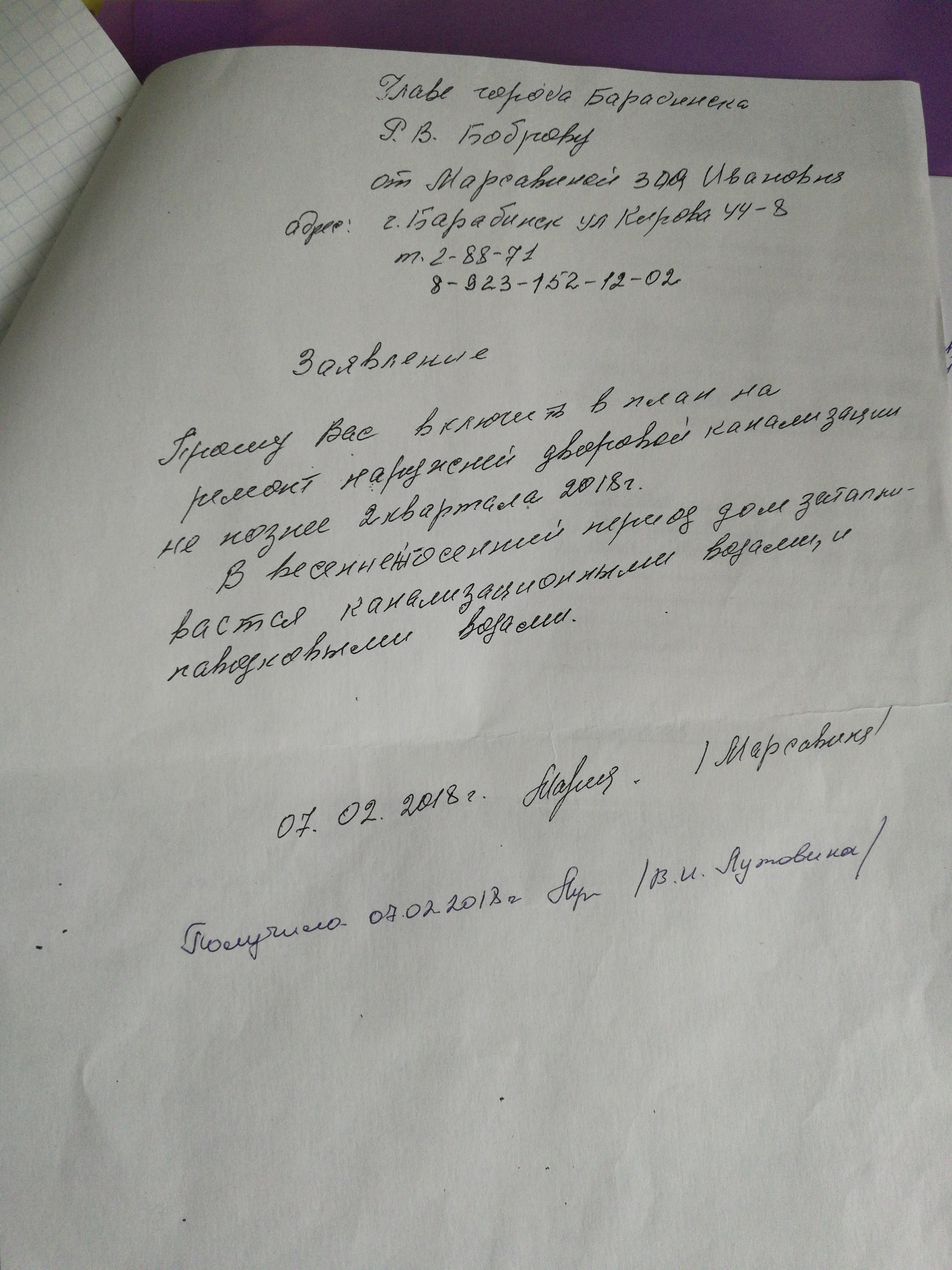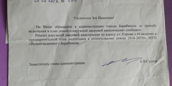 Номер жалобы:61425 Тип жалобы:Прочее Название объекта:Степанова Ирина Владимировна Регион:Новосибирская область Город:Барабинск Адрес:Ул Кирова, 44 Описание жалобы:Уважаемая организация "Гражданский патруль". Мы жители города Барабинска Новосибирской области, обращаемся к вам за помощью. Вот уже несколько лет пытаемся добиться ремонта канализации. От дома до колодца под землей полностью сгнила труба, все отходы впитывает земля под домом. В 18 году старшая по дому начала просить официально, чтоб заменили канализацию. Ответил Суслов начальник ЖКХ, что в 18-19 году до отопительного сезона все заменят. До сих пор ничего не сделали. Каждую весну и осень первый этаж вычерпывает фикалии с ванной, в мае 2019 от безвыходности, что 2 месяца приходилось вызывать аварийную бригаду, которые просто перестали качать жижу, так как это бесполезно, звонили во все инстанции. Приехала наконец бригада на осмотр проблемы, причем в 6ой раз за два года, выдернули остаток прогнившей трубы и уехали. Боимся дождей, устали биться в закрытую стену. Помогите пожалуйста. Статус: