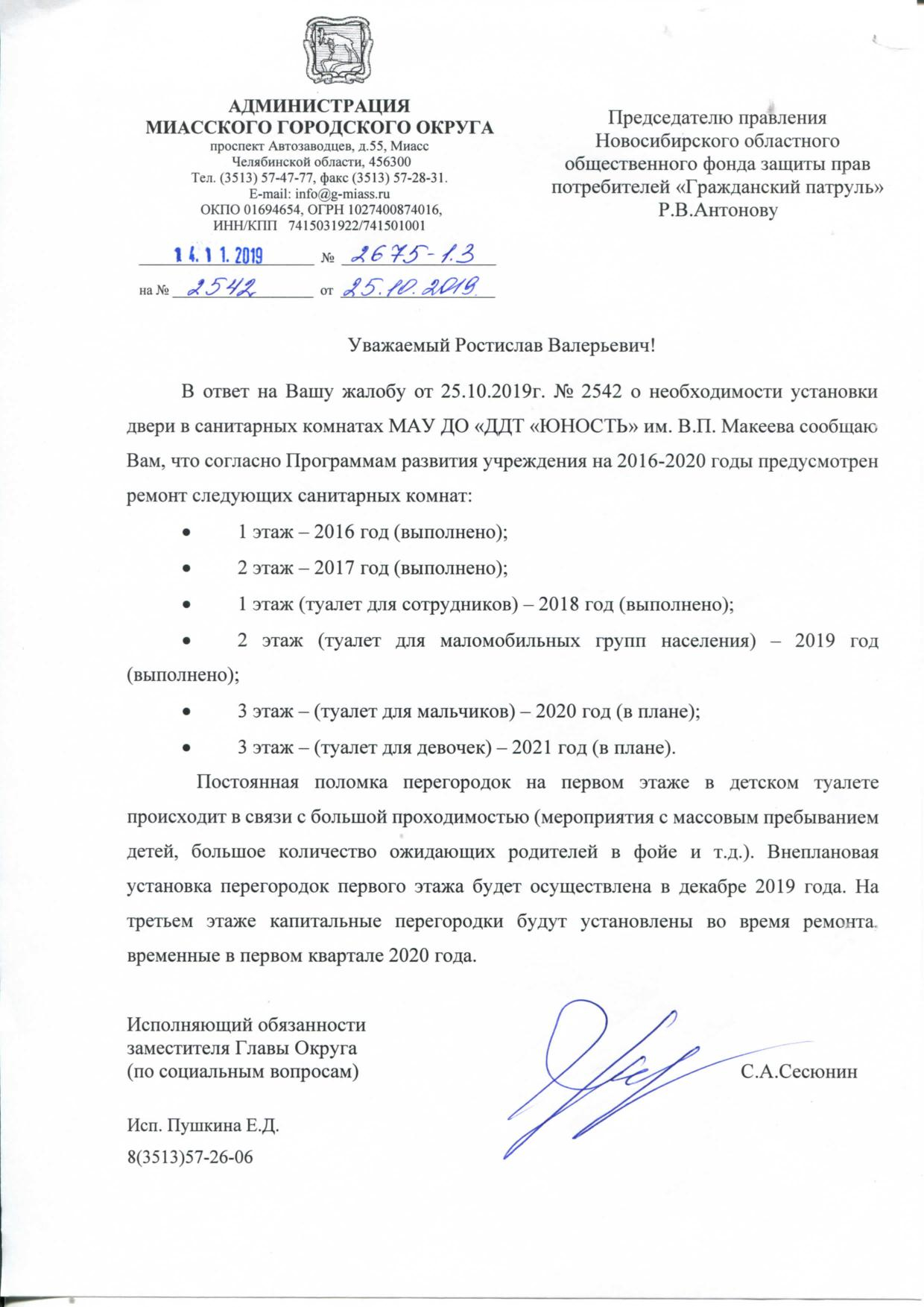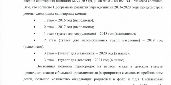 Номер жалобы:61473 Тип жалобы:Прочее Название объекта: Регион:Челябинская область Город:Миасс Адрес:проспект Макеева, 39 Описание жалобы:Просьба установить двери в кабинках туалета!Дети в ДДТ ходят разновозрастные и родителей много ожидает с занятий детей.Как всем ходить в туалет непонятно. Нарушение личного пространства. Статус: