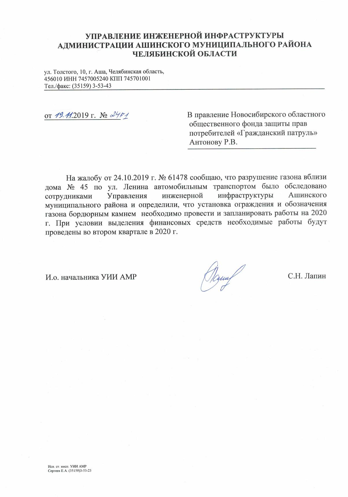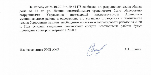 Номер жалобы:61478 Тип жалобы:Прочее Название объекта: Регион:Челябинская область Город:Аша Адрес:улица Ленина, 45 Описание жалобы:Автомобилисты превратили часть сквера у юношеской библиотеки в парковку, весь травяной слой уничтожен, необходимо оштрафовать водителей, а так же установить в этом месте антипарковочные столбики, что бы машины не ставили в этом месте. Статус: