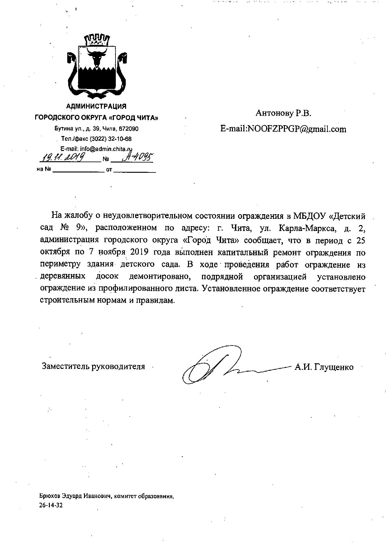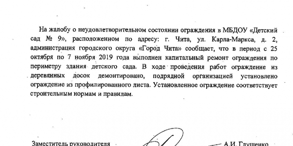 Номер жалобы:61490 Тип жалобы:Прочее Название объекта: Регион:Забайкальский край Город:Чита Адрес:улица Карла Маркса, 2А Описание жалобы:Детский сад#9. Забор в неудовлетворительном состоянии, стоит на подпорках и может завалиться. (Мою фамилию в заявлении не указывать) Статус: