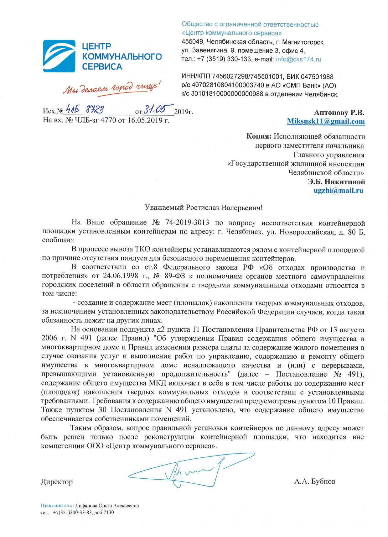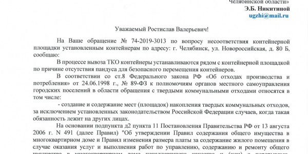 Номер жалобы:54213 Тип жалобы:Иные проблемы ЖКХ Название объекта: Регион:Челябинская область Город:Челябинск Адрес:Новороссийская улица, 80Б Описание жалобы:Устройство площадки для мусорных контейнеров не позволяет выкатывать их к машине для сбора мусора и потом закатывать обратно. Из-за этого конктейнеры всегода стоят рядом с площадкой и занимают часть проезжей части. Статус: