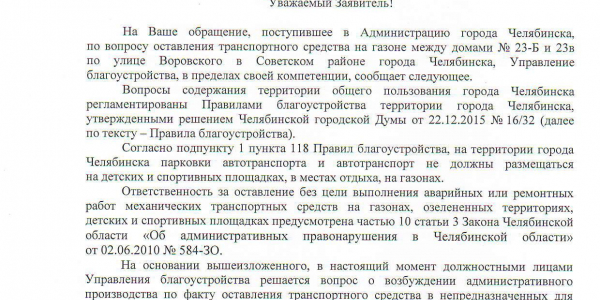 Номер жалобы:54216 Тип жалобы:Иные проблемы ЖКХ Название объекта: Регион:Челябинская область Город:Челябинск Адрес:Воровского, 23Б Описание жалобы:Парковка на газоне между Воровского 23Б и 23В Статус: