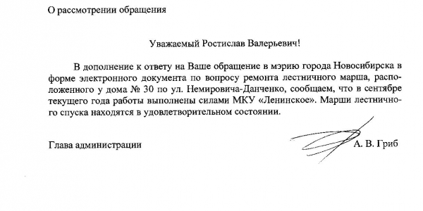 Номер жалобы:54396 Тип жалобы:Иные проблемы ЖКХ Название объекта: Регион:Новосибирская область Город:Новосибирск Адрес:улица Немировича-Данченко, 30 Описание жалобы:Разваливается гранитная лестница ведущая от светофора вниз на массив Статус: