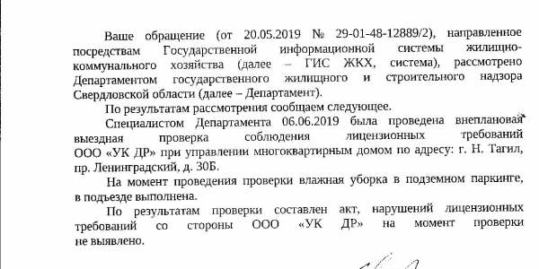 Номер жалобы:54507 Тип жалобы:Иные проблемы ЖКХ Название объекта: Регион:Свердловская область Город:Нижний Тагил Адрес:Ленинградский проспект, 30Б Описание жалобы:Ук Дзержинского района отказывается производить уборку в подземном паркинге. Ссылаясь на то что, 9 человек только заключили договора. Пожалуйста, пусть прибираются у тех 9ти с кем договора заключены. Статус:
